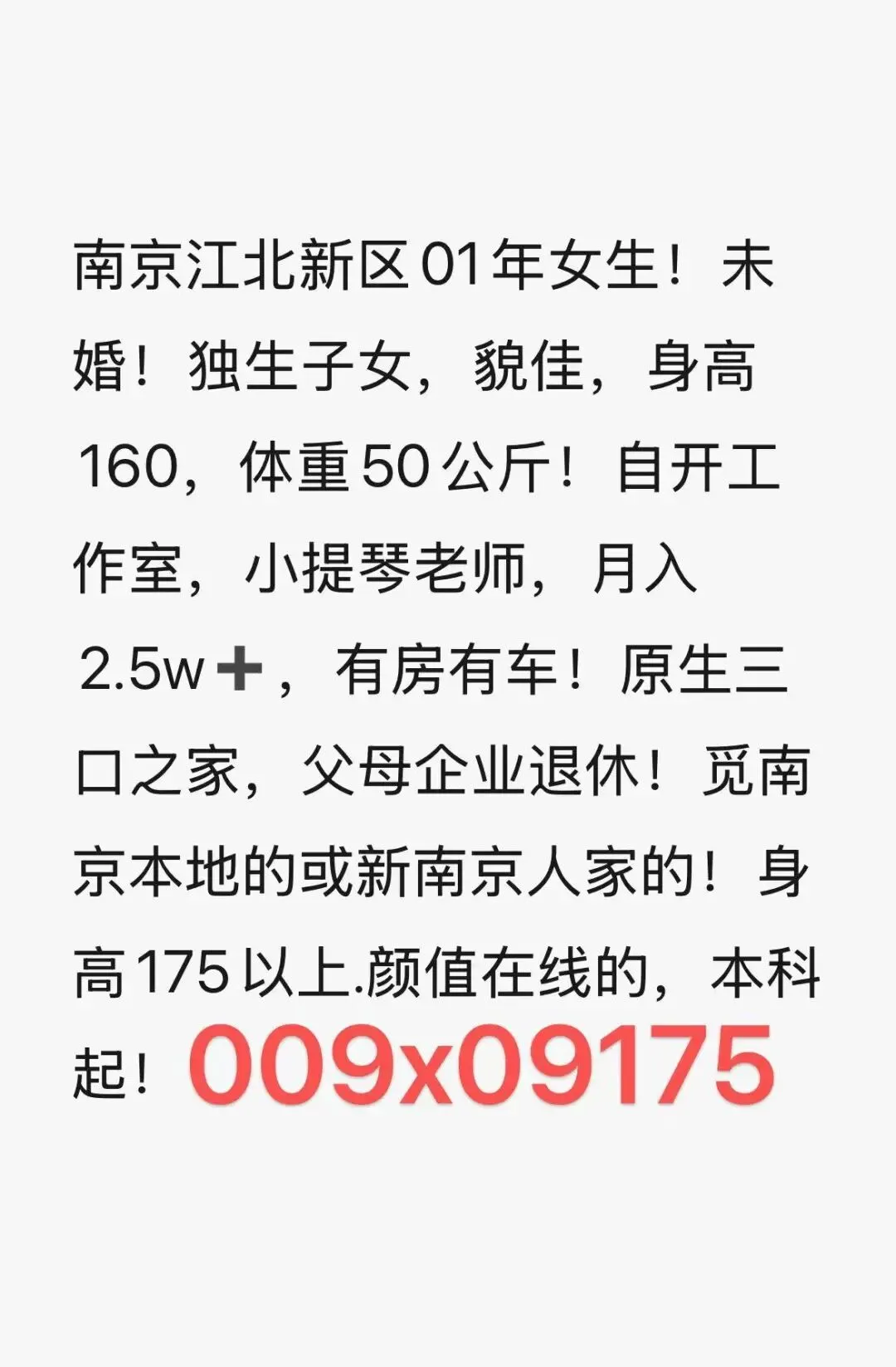 这是一个浮躁的时代,也是一个认识人成本极低的时代,无效的人和事占据太多的时间,骗子、约炮、理财销售等等让我们产生焦虑、内耗,为了帮助大家节约时间,相亲宝公众号发帖人不公布联系方式,我们红娘负责过滤一些不靠谱的人,专门进行验证,核实。提示大家:相亲急切的心情可以理解,但相亲过程中不要有任何金钱往来,切记切记。精准一对一推荐介绍,唯一线下门店地址:秦淮区大行宫长安国际2307。
