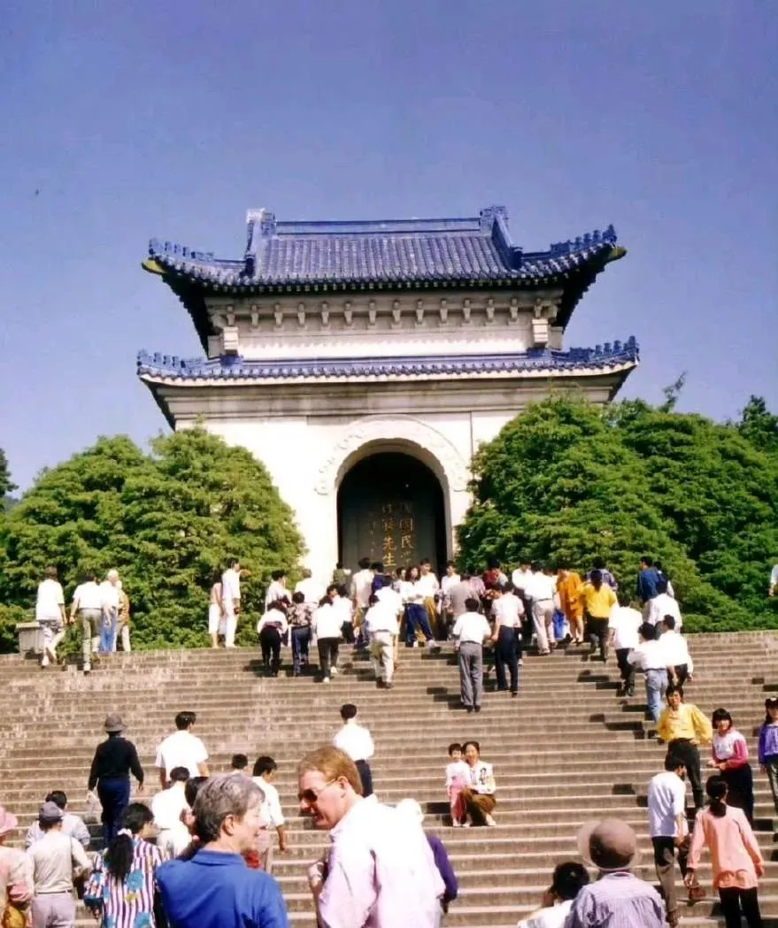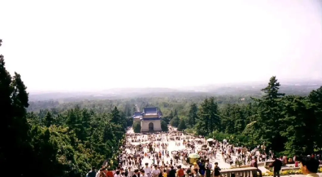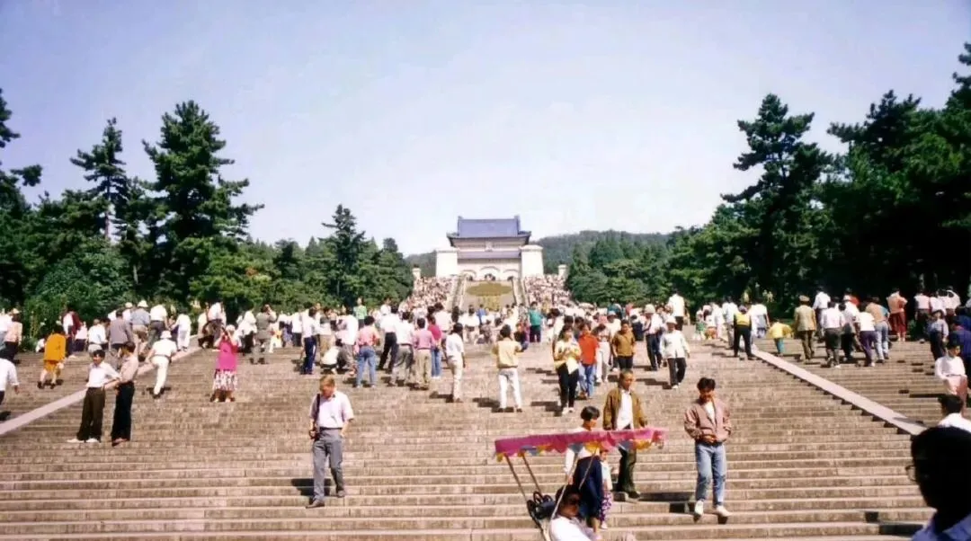 图中这片台阶叫中山陵石阶,青灰色的条石一层叠着一层,扶手是老式的青石栏板,屋脊那抹宝蓝色琉璃瓦在阳光底下亮得扎眼,游客沿着台阶往上走,鞋底在石面上摩擦出细细的沙沙声,偶尔有人停下喘口气,掏出傻瓜相机对着牌坊来一张合影,妈妈说那时候去趟中山陵,带壶水就够了,门票不贵,心气儿倒是挺足的。