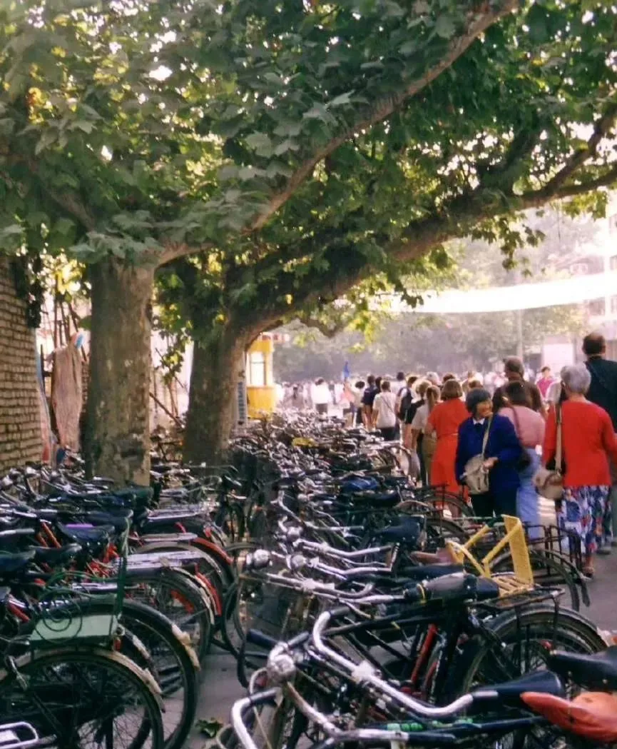 图里的铁家伙就是28大杠自行车,黑亮的车架,镀铬的车把,后座绑着橡皮绳,车铃一拧清脆叮当,树荫下挤得满满当当,一眼望不到头,爸爸说那会儿上班把车一锁,钥匙往口袋里一揣,谁也不担心找不到,因为大家都骑这个款,认车看的是自个儿车铃的声儿呢。