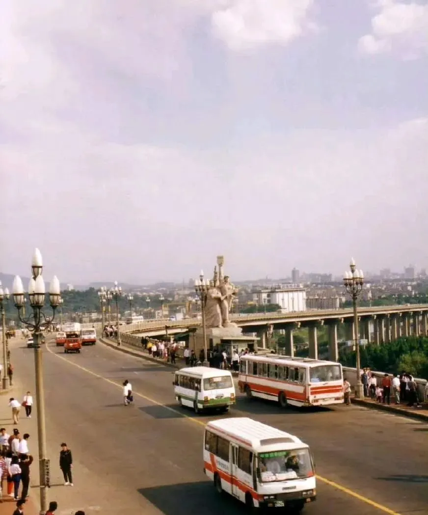 画面里这对高大的石像就是桥头雕塑,见证来来往往的公交车,白红相间的车身,窗子摇下一半,风灌进去把座椅背上的布套吹起一片弧线,售票员提着小包站在后门口喊着有下没有,清清嗓子再拉一把铃,车就稳稳起步了,现在刷卡滴一声就完事,以前这一嗓子像给车也给人提了气。