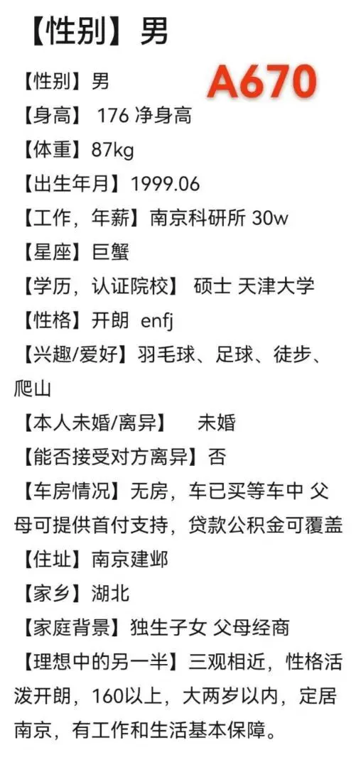 南京相亲丨99年,男,净身高176,天津大学硕士学历,南京科研所工作,有车可购房