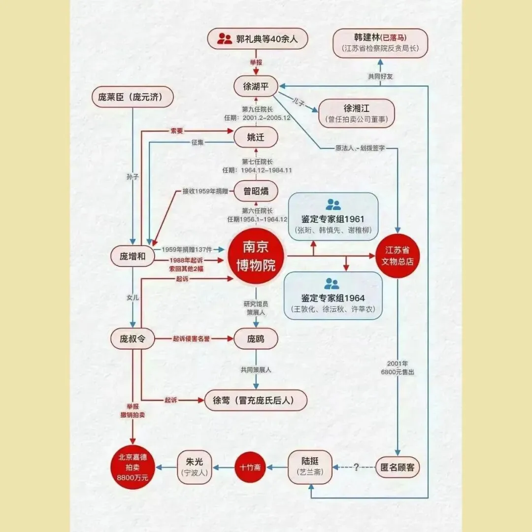 庞叔令,收藏家庞莱臣的曾孙女,庞增和之女,1959年无偿捐赠《江南春》等137件家族藏画的捐赠方的后人,她通过一系列法律与公开行动,将一桩家族捐赠旧事,升级为一场引发全国舆论关注的公共事件。庞氏家族的核心人物,庞元济,字莱臣,号虚斋,浙江湖州南浔人,其父庞云鏳为南浔四大富豪之一,庞莱臣为民国时期南方乃至中国最知名的书画藏家,当时被誉为“江南收藏甲天下,虚斋收藏甲江南”。庞莱臣一族育有庞维锡、庞维谨等子女,其孙辈包括庞增和、庞增祥等。庞莱臣先生在解放前去世后,家产由嗣子、两个孙子、继室夫人共同继承。2025年5月,庞叔令发现,本应被收藏在南京博物院的仇英《江南春》图卷,竟然出现在北京一拍卖预展上,估价达8800万元。庞叔令立即向国家文物部门举报,拍卖公司后撤拍。同时,庞叔令还表示,其于2025年6月前往南京博物院核验137件(套)藏品原件,发现除仇英《江南春》图卷外,还有赵光辅《双马图轴》、王绂《松风萧寺图轴》、王时敏《仿北苑山水轴》、汤贻汾《设色山水轴》等4件藏品也不见踪迹。而南京博物院对此的回应,上述5件藏品系伪作,已将这5件捐赠藏品剔除藏品序列,并对藏品原件进行划拨、调剂处理。但是,南京博物院并未提供这5件古画明确的划拨、调剂去向材料。庞叔令于是将南京博物院起诉至法院,要求其说明在南博“消失”的明代仇英《江南春》图卷等五件古画被“划拨、调剂”的具体流向,并最终将其返还。2025 年 12 月 17 日,南京博物院发布情况说明称,1959 年 1 月,该院正式接收庞增和先生(庞叔令女士父亲)捐赠的137幅庞家收藏画作。其中提及的5幅争议画作,1961年经由张珩、韩慎先、谢稚柳组成的专家组鉴定为“伪”;1964年经由王敦化、徐沄秋、许莘农组成的专家组再次鉴定为“假”。(1961年11月,原文化部组织以张珩(张葱玉)为主的全国书画鉴定专家组到南博进行书画鉴定,张珩、韩慎先、谢稚柳三位专家鉴定后认为:“江南春图卷,伪,一般,陈鎏题引首真,后面题跋完全不对,伪做得很好,原庞家是当真的藏的”。1964年6月,王敦化、徐沄秋、许莘农三位专家再次鉴定,认为“仇英江南春图卷,假”。)上世纪90年代,该院依照《博物馆藏品管理办法》对该5幅画作进行了处置。南京博物院通过新华社公布了一张落款时间为2001年、面额仅6800元的《仿仇英山水卷》等文物销售底单。追寻历史,庞家为江南首富,家藏殷实,南京博物院建院之初,巧妇难为无米之炊,遂经时任江苏省文化局副局长郑山尊介绍,家里有一亲戚名叫庞增和,是庞莱臣老先生之孙。郑氏出于爱国热忱,动员庞氏后人把祖上留下的文物捐赠给南京博物院。庞为之所动,挑选137件宋至清各时代的代表作品,捐赠南京博物院。包括如宋徽宗赵佶的《鸲鹆图》、黄公望的《富春大岭图》、吴镇的《松泉图》、倪云林的《丛篁木猪竹图》、仇英的《江南春》等众多的国宝级文物一并捐赠给南京博物院。这批藏品对于南京博物院展开学术研究,起到了巨大的支撑作用,也为南京博物院的学术繁荣做出了特殊贡献。尽管有此了不起的价值和意义,庞增和却不图一分钱之利,主动谢绝了南京博物院的奖励。后来因为各种需求,陆续还捐赠了多幅有珍贵意义的书画到南京博物院。南博事件江苏省调查组已于2025年12月25日抵达苏州。并到苏州庞叔令处,庞叔令以证人身份接受问询,问询时间持续了4.5小时。