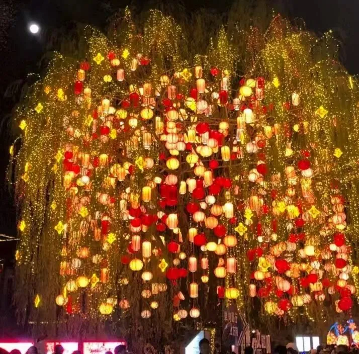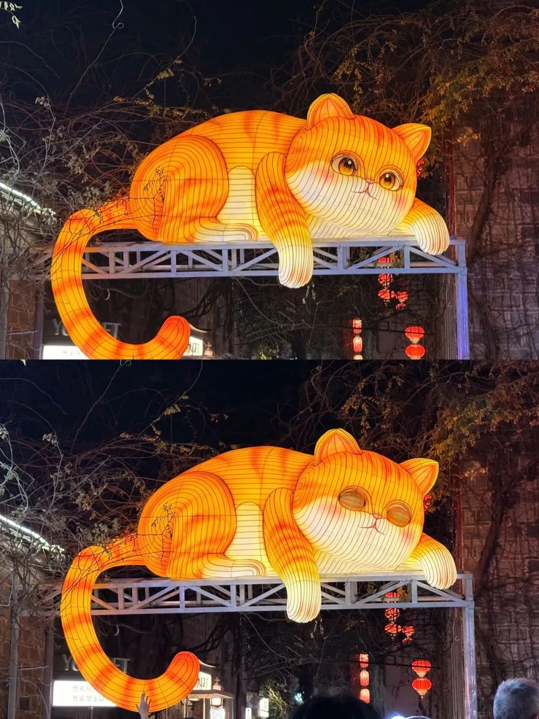 02今年999颗的灯树封神,明灯三千,花开满树,真的是东风夜放花千树,在此处具像化。神灯在此,我也向上天许愿,我的孩子们能够蟾宫折桂,考上理想的大学。明年高考,先在神仙处排个队,也怕神仙太忙,明年忙不过来。不止有正统,还有小可爱。萌猫的神奇之处在于,可以睁眼,可以闭眼,还会喵喵叫,可爱的不行,满足孩子们的需求。玩累了,渴了,可以在年货大集上尝尝梅花糕,糖人,还可以在麻花剧场沉浸式体验剧本杀,德云社(也放假了,25号开门)听听相声,品品越剧。