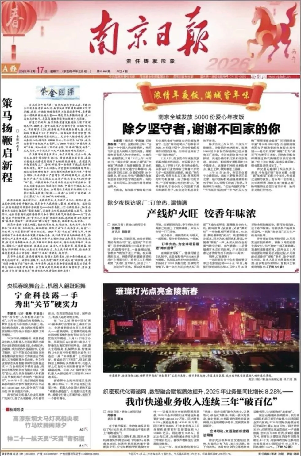 这个春节,当万家灯火团圆时,南钢的生产现场同样是一片红火景象。除夕、大年初一(2月16、17日),江苏卫视《江苏新时空》与《南京日报》头版纷纷将镜头对准了这片钢铁热土,报道了南钢人在假期里坚守岗位、保障全球供应的奋斗故事。
