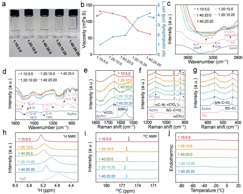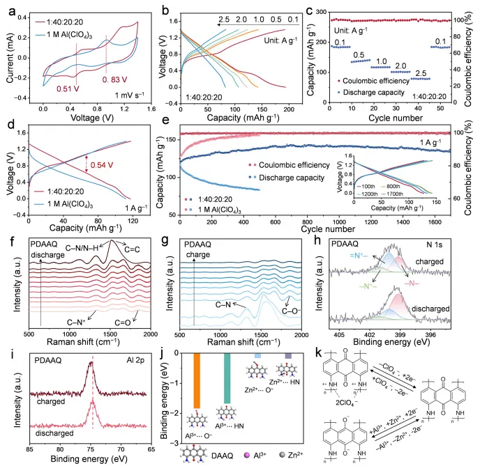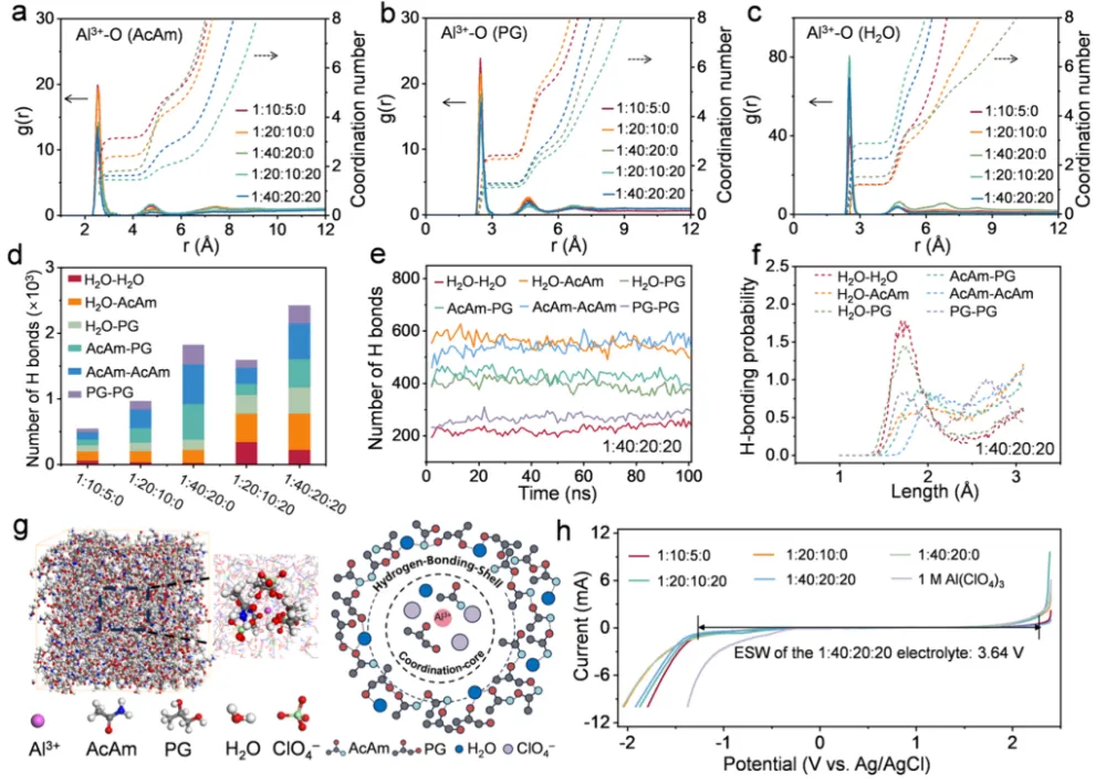 水系铝离子电池(AAIBs)凭借本征安全性高、成本低、体积容量大的优势,成为极具潜力的电化学储能技术,铝离子理论体积容量高达 8046 mAh cm⁻³,且铝资源储量丰富、环境友好。但 Al³⁺在水系电解液中易形成稳定的六水合络合物 [Al (H₂O)₆]³⁺,溶剂化能低至 - 4525 kJ mol⁻¹,强溶剂化作用导致界面脱溶能垒极高,严重限制 Al³⁺的迁移与电沉积动力学;同时 Al³⁺标准还原电位低(-1.667 V vs SHE),水系中易发生竞争性析氢反应(HER),且 Al³⁺水解会形成 Al (OH)₃钝化层,这些副反应共同阻碍离子传输与界面动力学,导致电池库仑效率低、循环稳定性差。现有电解液优化策略(高盐水系、有机 - 无机杂化、低共熔电解液等)各有缺陷:高盐水系电解液成本高、粘度大;有机 - 无机杂化电解液依赖易挥发 / 易燃有机溶剂,且难以有效调控 Al³⁺溶剂化壳层;传统水合低共熔电解液水含量远高于有机相,电化学稳定窗口(ESW)窄(低于 2.6 V),无法构建稳定的有机主导氢键网络,均难以同时实现抑制水活性、拓宽 ESW、提升 Al³⁺沉积动力学的目标。本研究摒弃传统电解液设计思路,聚焦于构建适配 Al³⁺高电荷密度与强极化特性的多组分动态平衡氢键网络,设计了由 Al (ClO₄)₃・9H₂O、乙酰胺(AcAm)、丙二醇(PG)和水以 1:40:20:20 摩尔比组成的深低共熔电解质(Al³⁺-DEE)。该电解质形成独特的双层溶剂化结构(配位主导的内核 + 氢键主导的外层),有效抑制自由水活性、缓解 HER、将 ESW 拓宽至 3.64 V,同时降低界面电阻、加速 Al³⁺传输动力学。通过基底筛选发现 Zn 是最优的 Al 沉积基底,可实现富铝 Al-Zn 合金共沉积;与聚 1,5 - 二氨基蒽醌(PDAAQ)正极匹配后,Zn/Al³⁺-DEE/PDAAQ 全电池在 1 A g⁻¹ 下比容量达 135 mAh g⁻¹,1700 次循环容量保持率 94%,还具备更高的电压平台与更低的极化程度,为高性能水系铝离子电池的电解液设计提供了全新思路。①电解液结构设计创新:首次构建 AcAm、PG 与水的多组分动态平衡氢键网络,形成 Al³⁺专属的双层溶剂化结构,突破传统低共熔电解液水相主导的局限,实现有机 - 水相的协同调控,同时兼顾非易燃性与高离子电导率;②溶剂化调控机制创新:利用 AcAm 和 PG 作为竞争性氢键供体,破坏刚性的水 - 水网络,限制自由水含量并弱化 Al³⁺- 溶剂相互作用,降低脱溶能垒,同时通过配位内核 + 氢键外层的结构协同,抑制 HER 和 Al³⁺水解,拓宽 ESW 至 3.64 V;③沉积与电池性能突破:实现 Zn 基底上的富铝 Al-Zn 合金均匀共沉积,解决 Al 金属基底钝化、Sn/Ni 基底沉积抑制的问题;全电池展现出长循环稳定性(1700 次循环保持 94% 容量)、高倍率性能与低极化,填补了水系铝离子电池富铝合金沉积与高稳定循环的技术空白。图 1:不同组分 Al³⁺-DEE 的理化性质与光谱表征图 1. (a) 不同摩尔比 Al (ClO₄)₃・9H₂O:AcAm:PG:H₂O 的 Al³⁺-DEE 光学照片;(b) 25℃下 Al³⁺-DEE 的离子电导率与粘度;(c, d) AcAm、PG 及 Al³⁺-DEE 的傅里叶变换红外(FTIR)光谱;(e−g) 1 M Al (ClO₄)₃水溶液、AcAm、PG 及 Al³⁺-DEE 的拉曼光谱;(h) Al³⁺-DEE 的 ¹H 核磁共振(NMR)光谱;(i) Al³⁺-DEE 的 ¹³C NMR 光谱;(j) Al³⁺-DEE 的差示扫描量热(DSC)曲线。清晰展示 Al³⁺-DEE 的组分调控规律与分子间相互作用:①理化性质可控:所有 Al³⁺-DEE 均为澄清均相液体,引入适量水可有效降低粘度、提升离子电导率,1:40:20:20 组分配比实现粘度与电导率的最优平衡;②氢键网络形成:FTIR 光谱中 ν(O-H) 与 ν(N-H) 峰宽化、AcAm 的 ν(C=O) 红移,拉曼光谱中 AcAm 特征峰蓝移、ClO₄⁻对称伸缩峰位移,证实 AcAm、PG 与水形成了动态氢键网络,且与 Al³⁺存在配位作用;③溶剂化环境验证:NMR 光谱中 H₂O 信号低场位移、AcAm 羰基碳高场位移,表明氢键网络改变了溶剂化环境,1:40:20:20 配比下网络达到稳态,加水不破坏结构稳定性;④热稳定性与安全性优异:DSC 显示其熔点低至 - 90℃以下,阻燃性测试证实 1:40:20 和 1:40:20:20 配比的 Al³⁺-DEE 均为非易燃,满足实际应用要求。图 2:不同组分 Al³⁺-DEE 的结构与电化学特性图 2. (a−c) 分子动力学(MD)模拟得到的 Al³⁺与 AcAm、PG、H₂O 中 O 原子的径向分布函数(RDF)与配位数;(d) 不同电解液的氢键总数;(e) 1:40:20:20 Al³⁺-DEE 中氢键数的时间演变;(f) 1:40:20:20 Al³⁺-DEE 中氢键键长的概率分布;(g) 1:40:20:20 Al³⁺-DEE 的 MD 模拟快照与溶剂化模型示意图;(h) 不同配比电解液的电化学稳定窗口(ESW)。深入解析 Al³⁺-DEE 的溶剂化结构与电化学基础特性:①配位数演变规律:随 AcAm 和 PG 含量增加,其与 Al³⁺的配位数逐渐降低,H₂O 和ClO₄⁻与 Al³⁺的配位数升高,1:40:20:20 配比中 H₂O 和ClO₄⁻成为 Al³⁺主要配位物种;②氢键网络特征:加水后氢键网络从 “有机主导” 转变为 “有机 - 水协同”,氢键类型分布更均衡,且主要氢键(含 AcAm)在 100 ns 模拟中保持稳定,水和 PG 的自缔合被显著抑制,氢键键长主要集中在 1.7-2.2 Å(强氢键范围);③双层溶剂化结构确立:Al³⁺优先与 H₂O、ClO₄⁻形成致密的配位内核,过量有机相在外侧形成致密的氢键外层,该结构为 Al³⁺脱溶与电化学性能提升奠定基础;④ ESW 显著拓宽:所有 Al³⁺-DEE 的 ESW 均远宽于 1 M Al (ClO₄)₃水溶液,1:40:20:20 配比的 ESW 达 3.64 V,证实双层溶剂化结构可有效抑制 HER 和析氧反应(OER)等副反应。图 3:不同电解液中对称电池与非对称电池的电化学表征图 3. (a) 0.2 mA cm⁻² 下 Zn//Zn 对称电池在不同 Al³⁺-DEE 与 1 M A