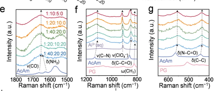 | | 化学键沿键轴方向的伸长或缩短(键长变化),是最常见的振动模式 | - ν(O-H):PG 中 O-H 键的伸缩振动(~3382 cm⁻¹)- ν(N-H):AcAm 中 N-H 键的伸缩振动(~3206 cm⁻¹)- ν(C=O):AcAm 中羰基 C=O 键的伸缩振动(~1673 cm⁻¹)- ν(ClO₄⁻):ClO₄⁻ 阴离子的对称伸缩振动(~914 cm⁻¹) |