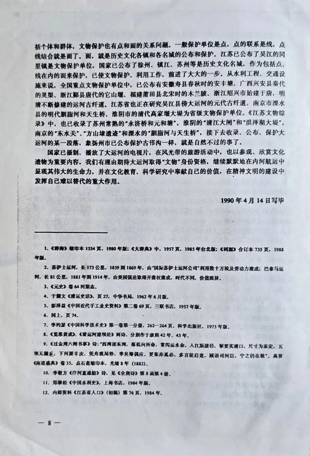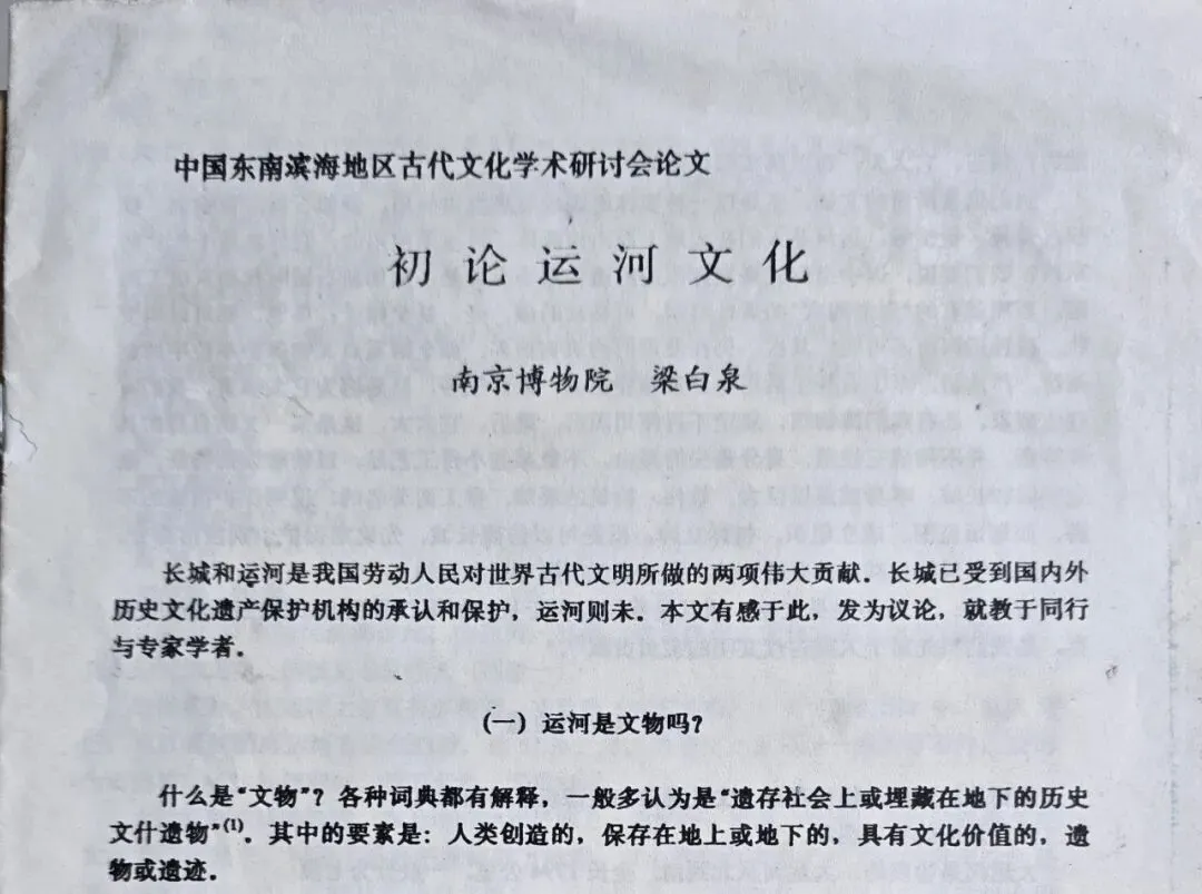 1990年,时任南京博物院院长的梁白泉先生向“中国东南滨海地区古代文化学术研讨会”提交了题为《初论运河文化》的论文,系统提出“运河文化”这一学术概念。文章开篇指出:“长城和运河是我国劳动人民对世界古代文明所做的两项伟大贡献”,但运河并未如同长城那样受到国内外历史文化遗产保护机构的承认与保护。基于这一现实,梁白泉先生从“运河是文物吗?”“运河的价值”“运河的保护和利用”三个方面,系统论证了运河文化的概念。他在文中明确提出,大运河完全符合文物的核心要素——“人类创造的、保存在地上或地下的、具有文化价值的,遗物或遗迹”,认为运河作为文化载体的遗存,理应被认定为一项巨大的线性“文物”。文章还指出,运河具有物质、文化和生态等多重价值,强调运河保护需在防止淤塞与防止污染的基础上,做好运河文物的保护工作,落实保护措施,以充分发挥其精神文明教育的作用。梁白泉先生的《初论运河文化》,是目前已知最早系统提出“运河文化”概念的文章,对推动大运河文化的研究产生积极深远的影响。