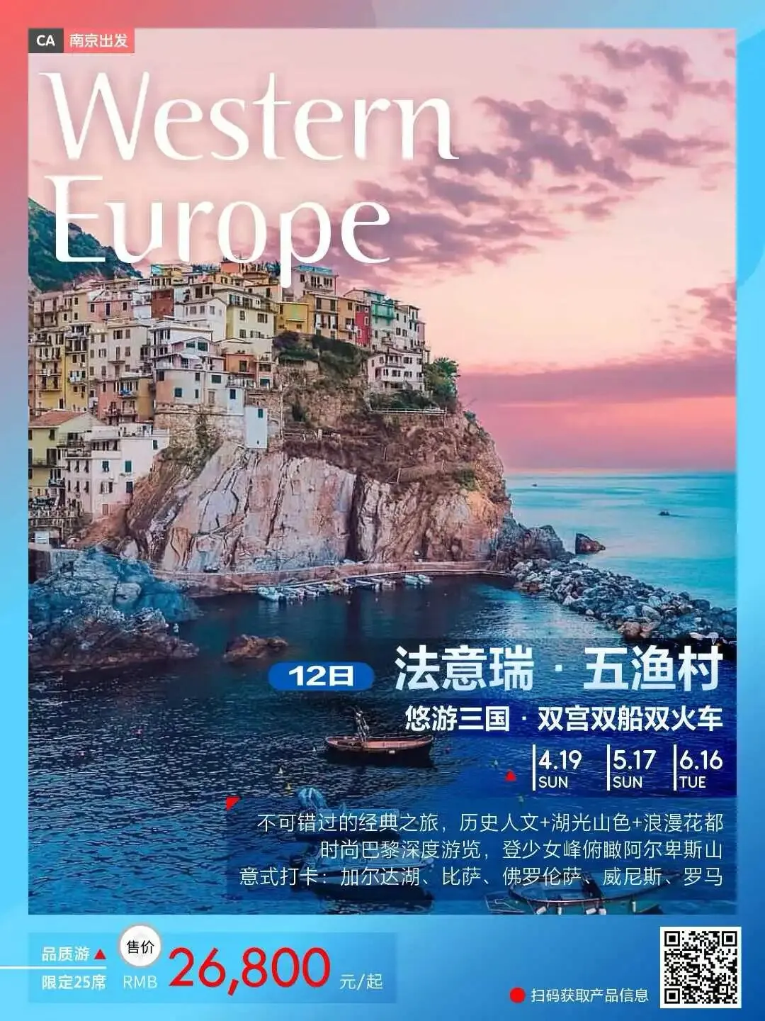 【爆款欧洲】南京出发南京按指纹法意瑞+五渔村12天26800元起,不推荐任何自费.