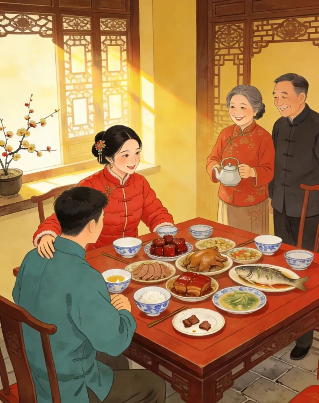 还有一个不常见的小知识点:以前南京初二回娘家,姑娘要给父母“拜寿”,哪怕父母没到寿辰,也要磕三个头,说一句“愿父母安康”,这是对父母养育之恩的感恩;而父母会给女婿“压岁钱”,寓意“接纳女婿,盼他顺遂”。现在,磕头的礼仪少了,但这份感恩与牵挂,依然没变。