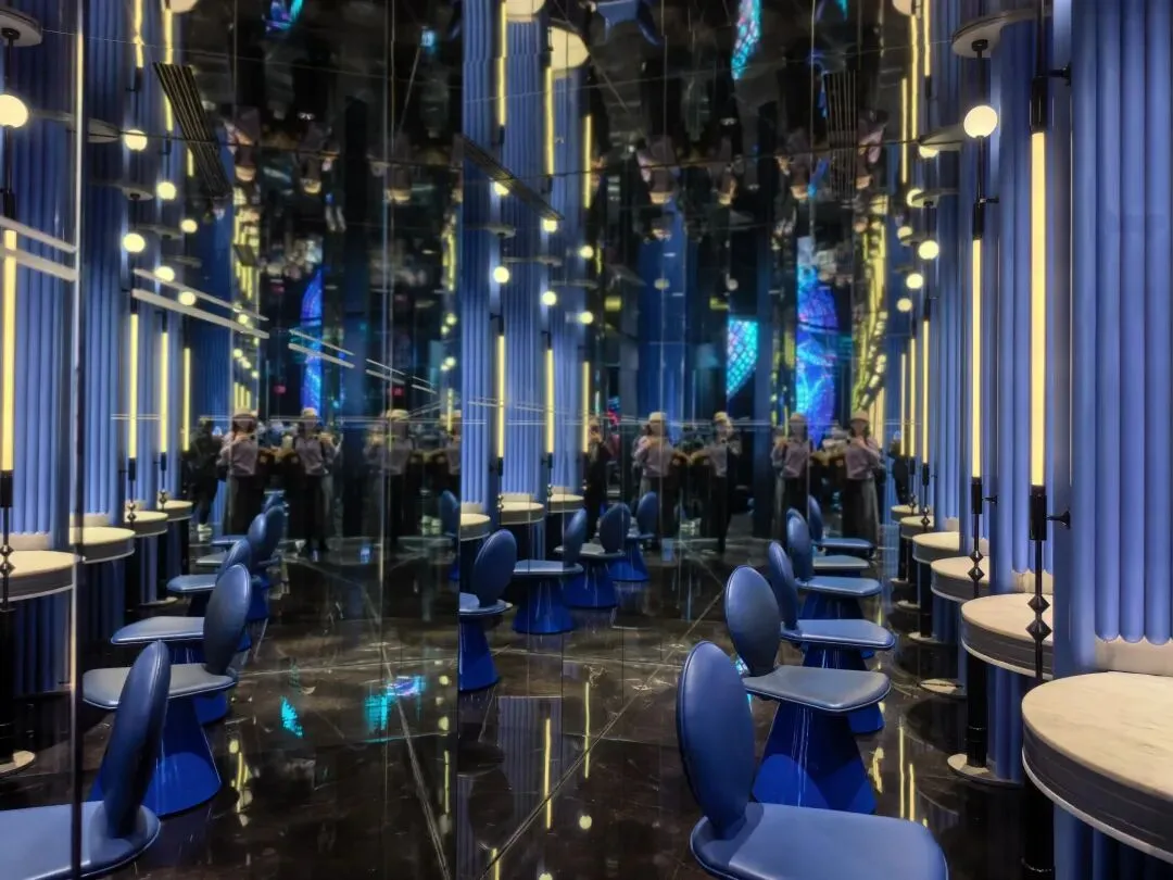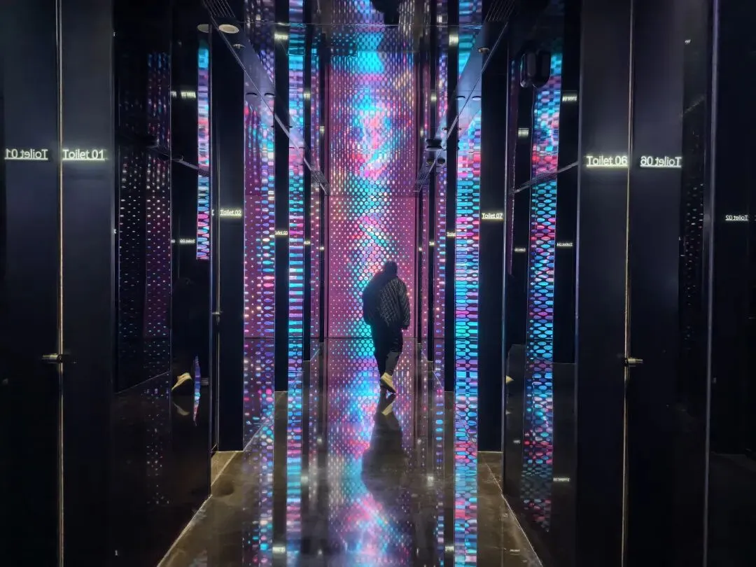 最贵的3F厕所是赛博朋克风,里面的布置是机械齿轮、全息洗手池、蓝紫激光,像夜店也像科幻片场。
