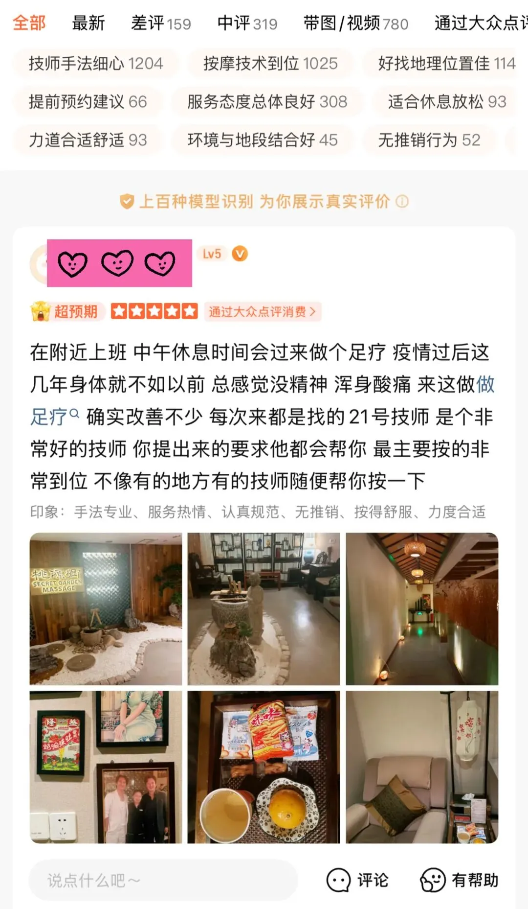 在大众点评上,桃源乡南京东路店累计评价超过5500条,评分高达4.5分。有超过1200条评价提及“技师手法细心”,超过1000条评价提及“按摩技术到位”。一位顾客写道:“朋友带着来的,环境很好,全身精油SPA,39号和69号技师手法很到位,还有送小零食。”还有一位顾客写道:“每次来都是找的21号技师,是个非常好的技师,你提出来的要求他都会帮你,最主要按得非常到位,不像有的地方有的技师随便帮你按一下。”这些数据和评价同样也在韩国游客的上海攻略里口口相传。