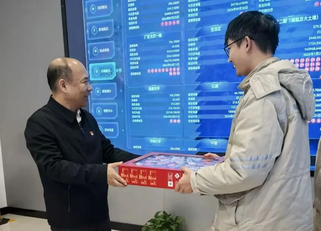 毕宏远先后到检修班组和运行集控室,和值班人员亲切交流并送上节日慰问礼品,详细了解机组运行状况、储能和光伏运行情况等。