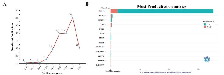 - 2017-2025年间,铁死亡与胃癌研究领域的发文量呈持续上升趋势。从2017年的2篇增长至2024年的122篇峰值,2025年截至4月为41篇。这表明该领域学术关注度快速攀升。