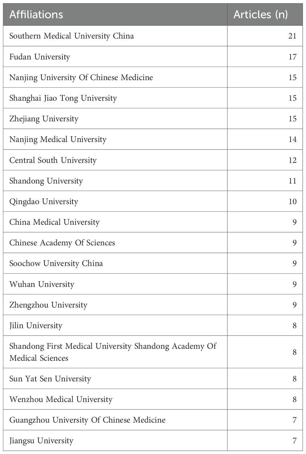 南方医科大学(21篇)、复旦大学(17篇)为最主要研究机构。