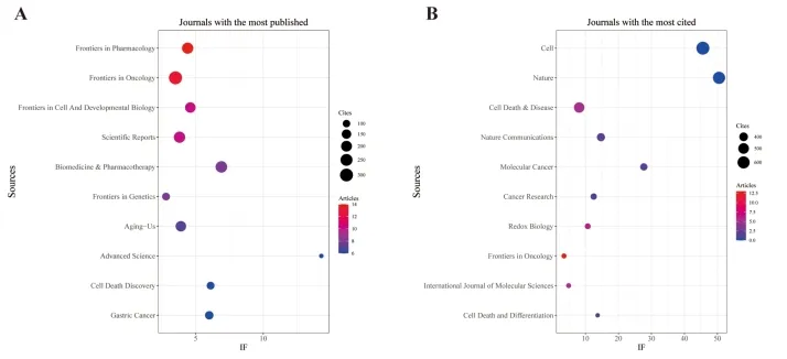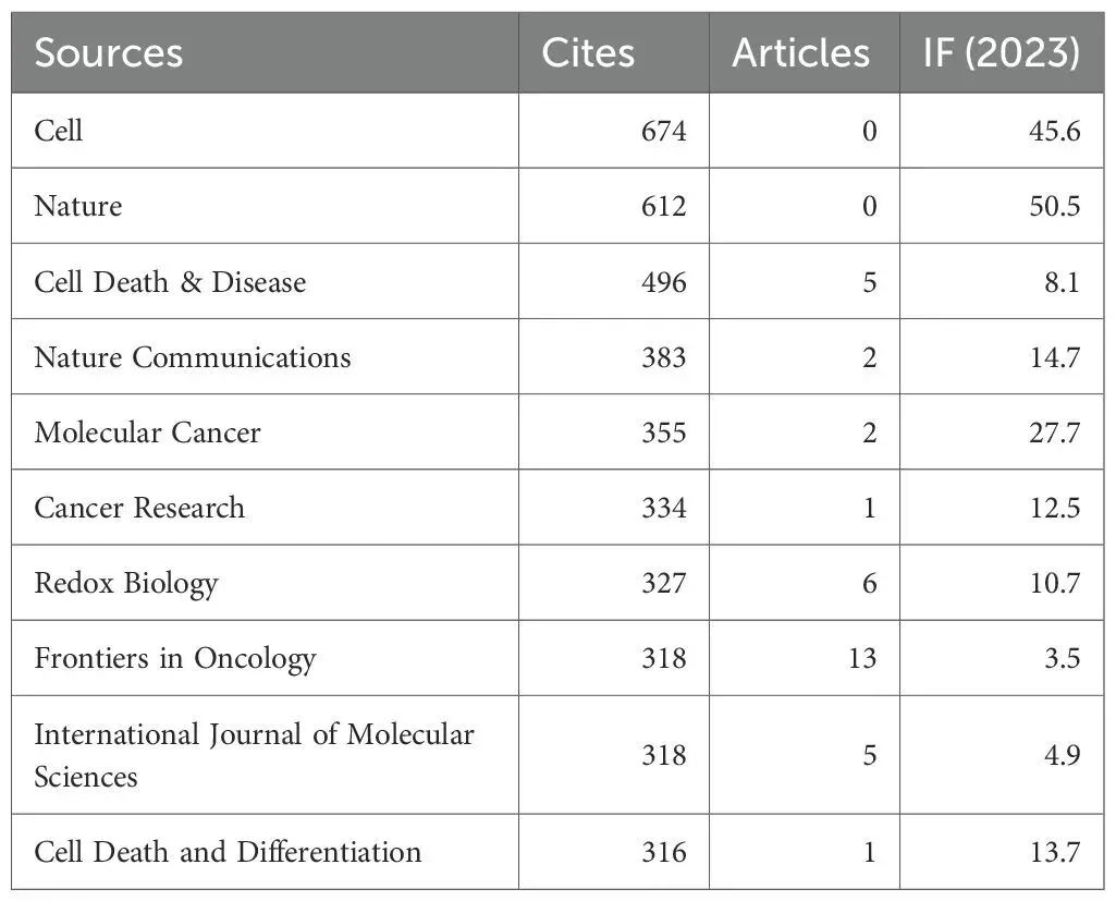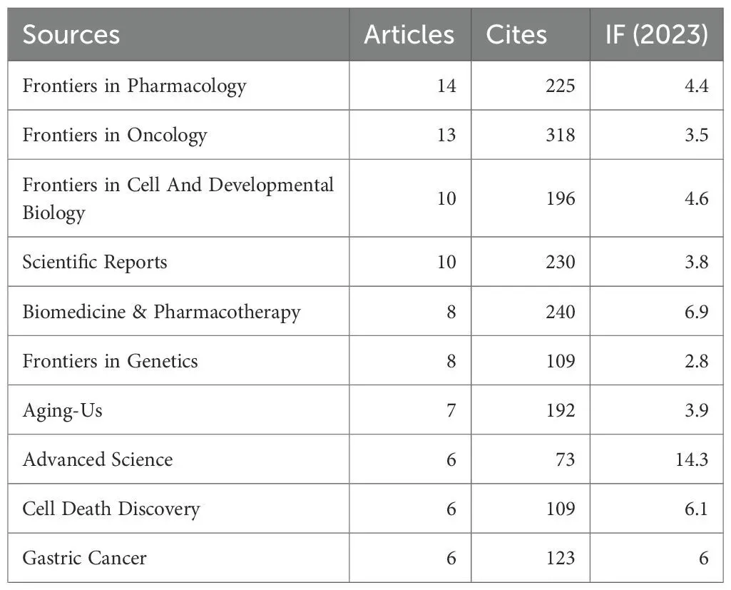 - 《Frontiers in Pharmacology》(14篇,IF=4.4)和《Frontiers in Oncology》(13篇,IF=3.5)发文量最高,其次是《Frontiers in Cell and Developmental Biology》和《Scientific Reports》(各10篇)。