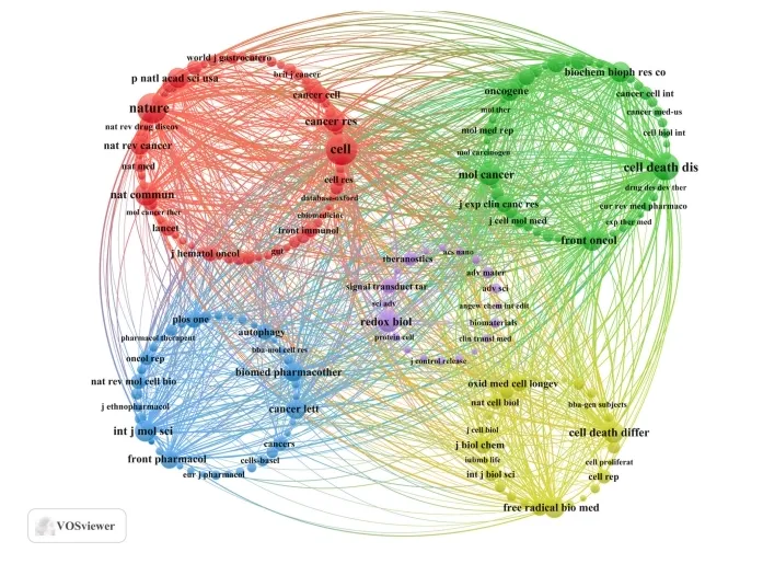 该图显示《Nature》、《Cell Death & Disease》和《International Journal of Molecular Sciences》处于共被引网络中心,表明这些期刊构成了该领域的知识基础核心,研究内容高度交叉融合。