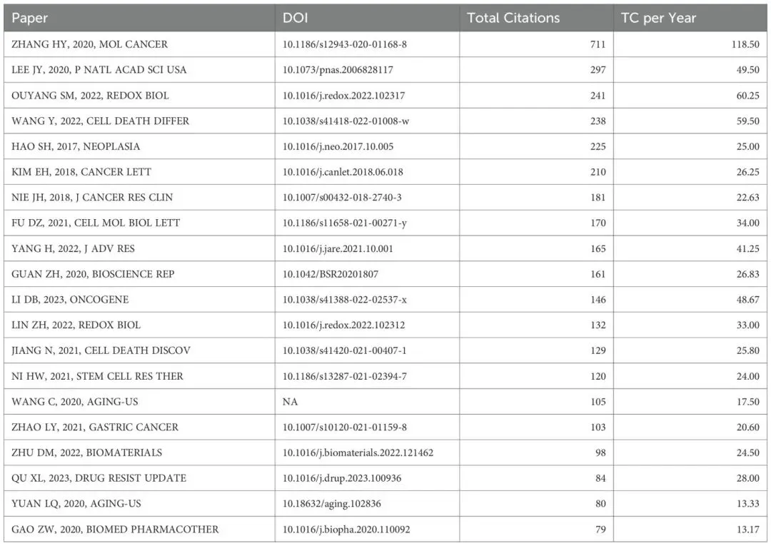 - 排名前20的文献均被引超过75次,最高为Zhang等(2020)关于CAF分泌miR-522抑制铁死亡的研究(711次)。