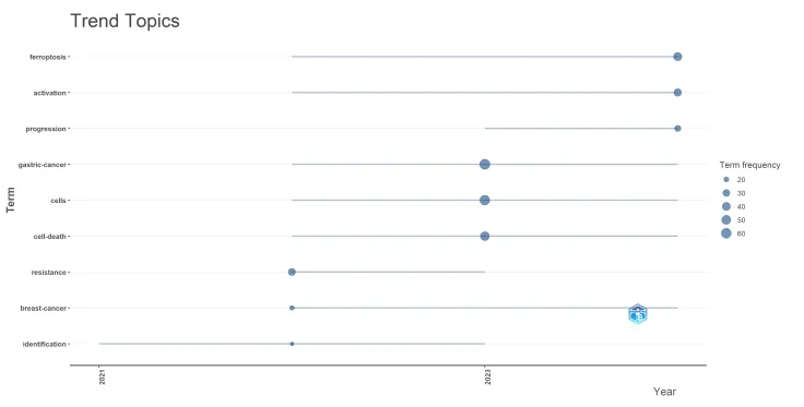 主题演化显示:2021年主要关注铁死亡分子标志物识别;2022-2023年转向胃癌铁死亡机制与耐药逃逸通路研究。