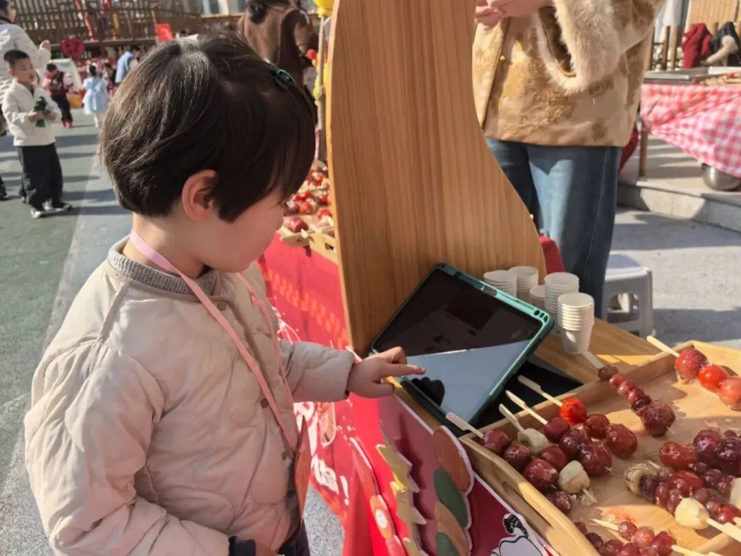 美食街的生意非常火爆,小朋友们迫不及待地来到自己喜欢地美食摊前游戏排队,再次将信息技术和传统点单相结合,共同根据自己喜欢吃的口味在平板上自主下单,品尝着香香甜甜的味道。