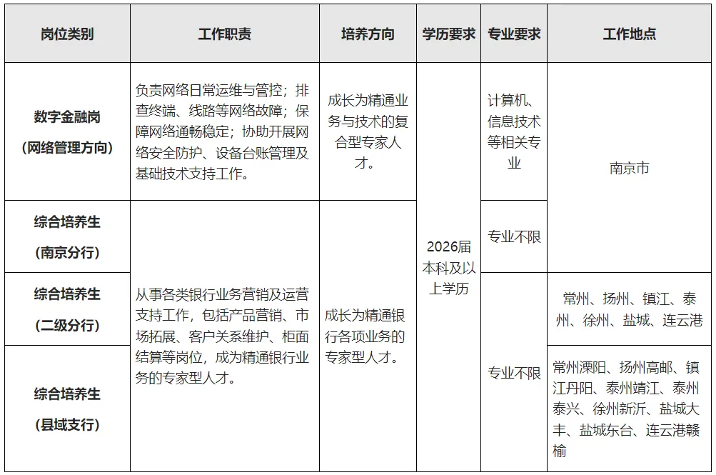 三十年来,招商银行南京分行始终坚持稳健经营,规范管理,从严治行的方针,力求为员工提供完善的培训体系、公平的竞争机制、广阔的职业平台、多样的员工关怀。我们竭诚欢迎有志于金融改革创新、勇于接受挑战、德才兼备的2026届应届优秀学子加盟,共创招行美好未来。