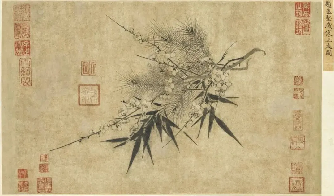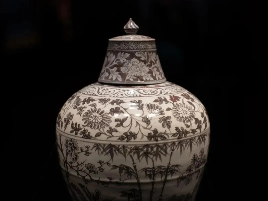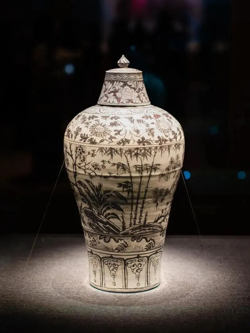 纹饰中的七层纹饰构成严密的视觉叙事体系:顶部火焰形盖钮象征皇权,颈部蕉叶纹承继元代风格,肩部如意云纹、卷草纹、缠枝菊花纹三重辅纹寓意吉祥,腹部主纹“岁寒三友”以松(长青)、竹(气节)、梅(傲骨)构成文人精神图腾,其间添绘的芭蕉(非耐寒植物)打破题材逻辑,实则是为追求画面平衡的匠心设计——这种“洪武式加法”影响明清两代,成为岁寒三友纹的固定范式。