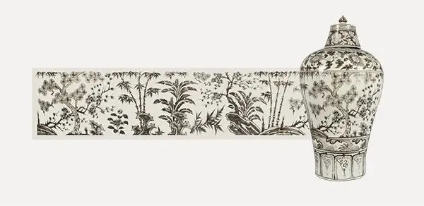 元代,受到景德镇制瓷业大发展的影响,梅瓶有新的变化,整体造型高体宽大、上腹饱满,并出现了以青花为主的品种;在纹饰上多以吉祥内容和织锦图案装饰,也流行历史故事、戏剧故事等题材。