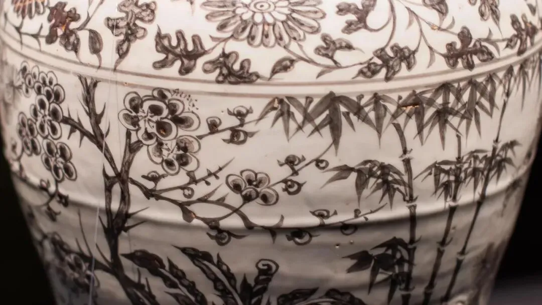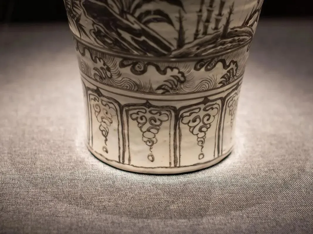 尽管部分纹饰因窑变呈现黑褐色(如松针边缘的晕散),却意外形成“墨分五色”的写意效果,与元代青花的浓艳形成鲜明对比,开启了明代瓷器“素雅留白”的审美新风。
