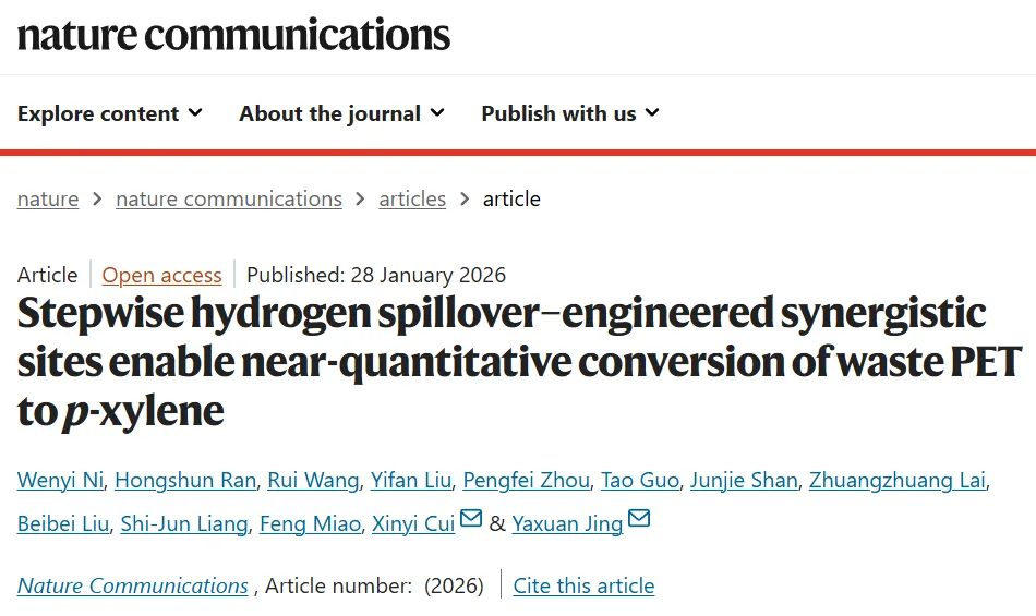 Stepwise hydrogen spillover–engineered synergistic sites enable near-quantitative conversion of waste PET to p-xylene. Wenyi Ni, Hongshun Ran, Rui Wang, Yifan Liu, Pengfei Zhou, Tao Guo, Junjie Shan, Zhuangzhuang Lai, Beibei Liu, Shi-Jun Liang, Feng Miao, Xinyi Cui* & Yaxuan Jing*. Nat Commun (2026).