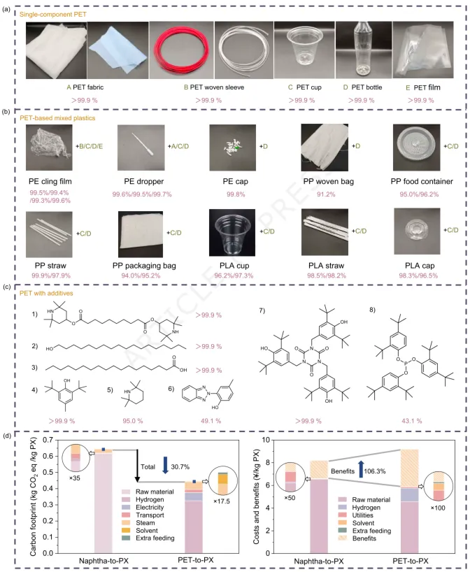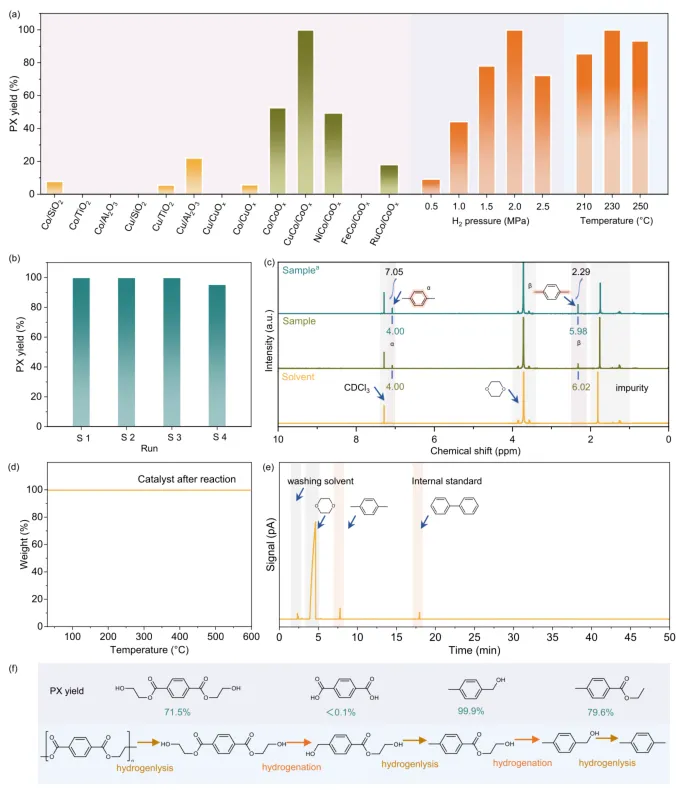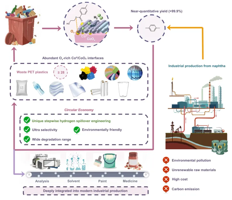 塑料废弃物的高值化利用因具有严重的环境影响,成为 21 世纪面临的重大挑战。南京大学景亚轩助理教授、崔昕毅教授报道了一种通过分步氢溢流策略构建的 CuCo/CoOₓ催化剂,该催化剂可实现废聚对苯二甲酸乙二醇酯(PET)向对二甲苯的近定量转化(转化率>99.9%),催化性能显著优于各类铜基、钴基催化剂及已报道的贵金属催化剂。分步氢溢流作用可诱导生成部分相转变的金属钴物种,并形成大量富含氧空位的 Co⁰/CoOₓ界面;其中,金属钴物种可提升氢气解离效率,而该复合界面能促进聚对苯二甲酸乙二醇酯中碳 - 氧键的活化,并调控底物 - 产物的吸附平衡,二者协同赋予催化剂优异的催化性能。该催化剂展现出广泛的适用性,可对 30 余种实际商用聚酯塑料实现高效转化;此外,技术经济分析结果表明,该工艺能大幅降低二氧化碳排放量,且具备极具竞争力的加工成本。该研究在 PET 近定量转化领域取得的突破,以及通过分步氢溢流构建催化活性位点的策略,为塑料废弃物的升级再造及先进多相催化剂的设计提供了重要参考。