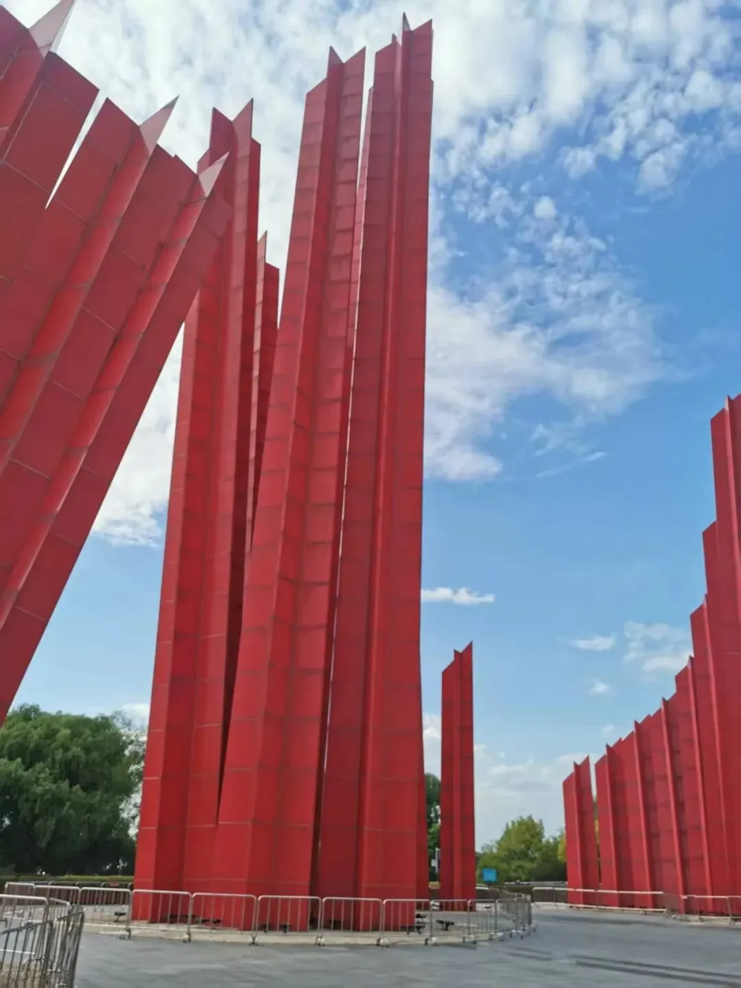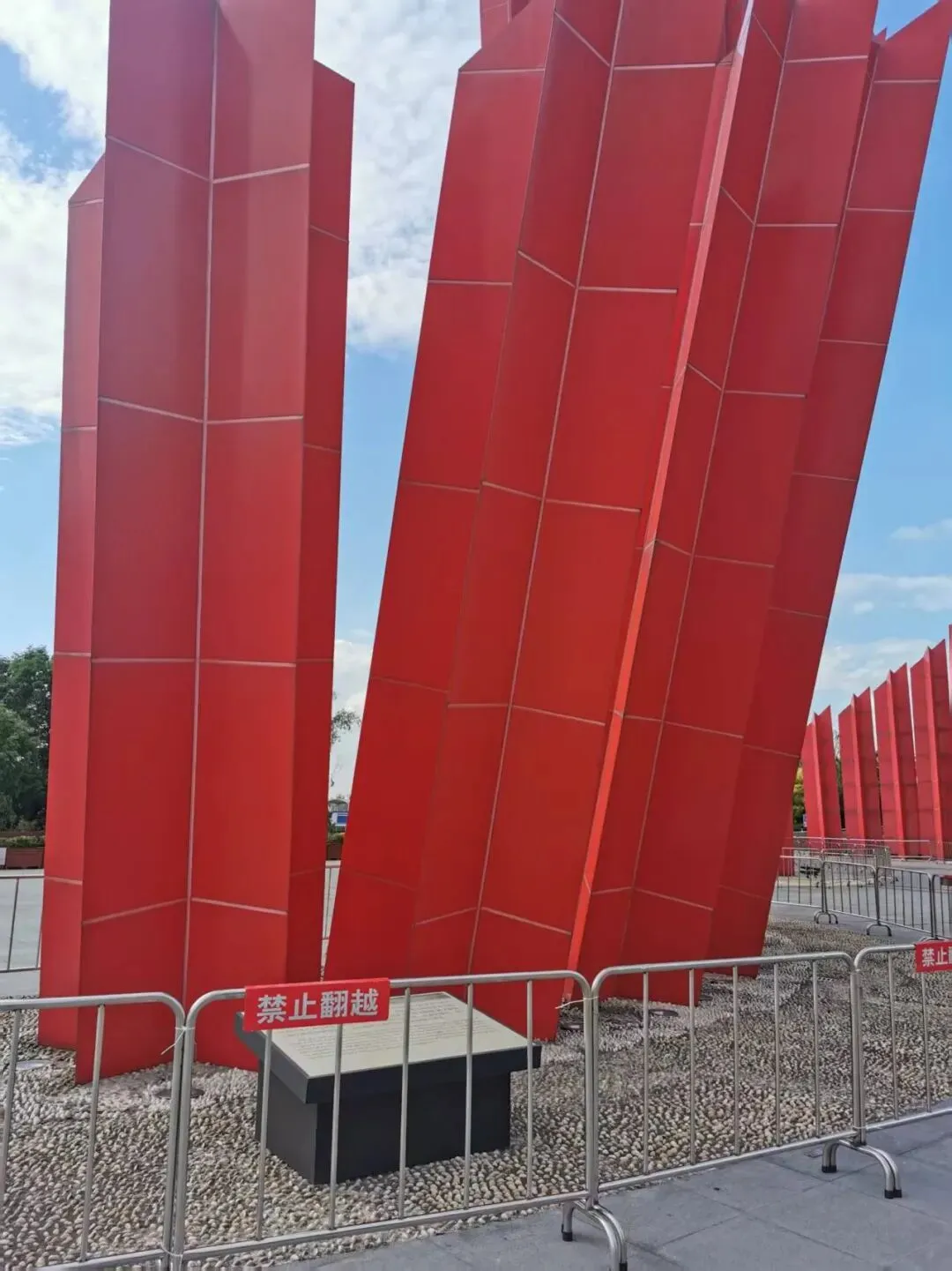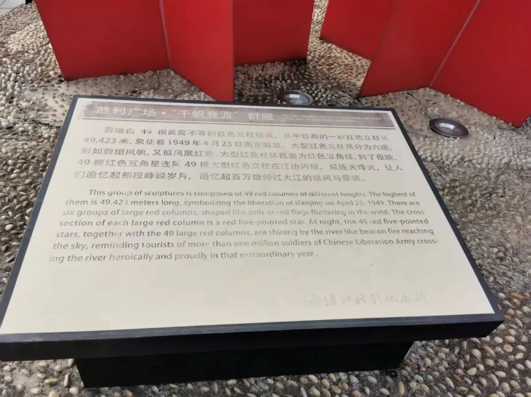 渡江胜利广场上矗立着大型“千帆竞渡”群雕。群雕共分为六组,呈红色直线柱体形式,截面为红色五角星。其中最高的一根红色立柱长49.423米,象征着1949年4月23日南京解放。到了夜晚,49颗红色五角星连同49根大型红色立柱在江边闪耀,犹如灯塔一般指引着革命者奋勇向前,又似连天烽火,让人们追忆起60年前那段峥嵘岁月,追忆起百万雄师过大江的雄风与豪情。