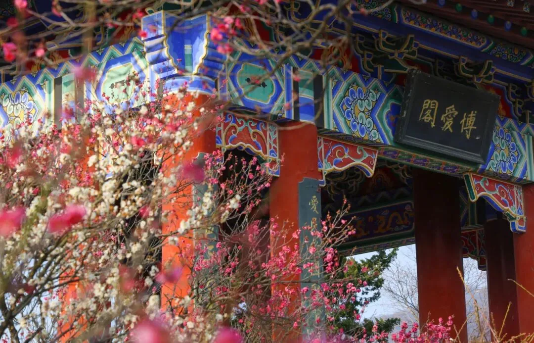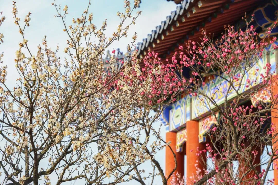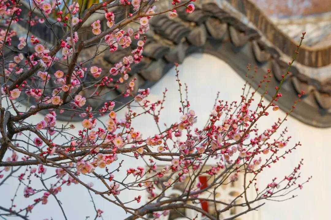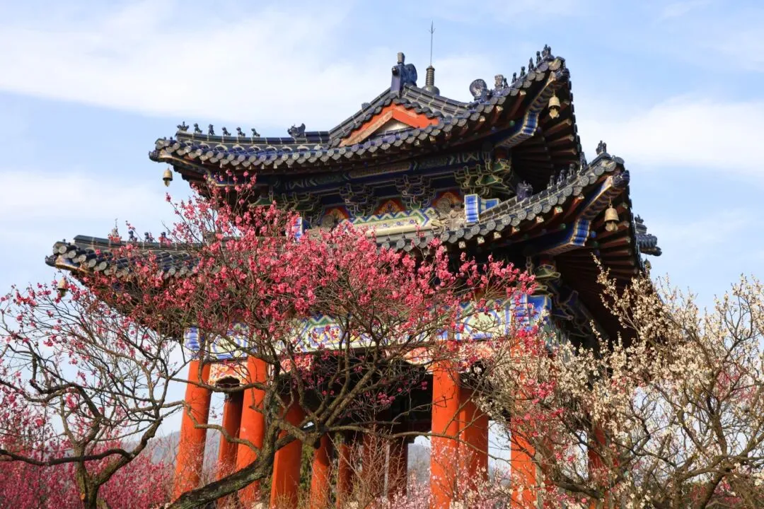 红楹黛瓦,飞檐翘角风起时,檐角八只风铃清脆作响与满山暗香一同摇曳