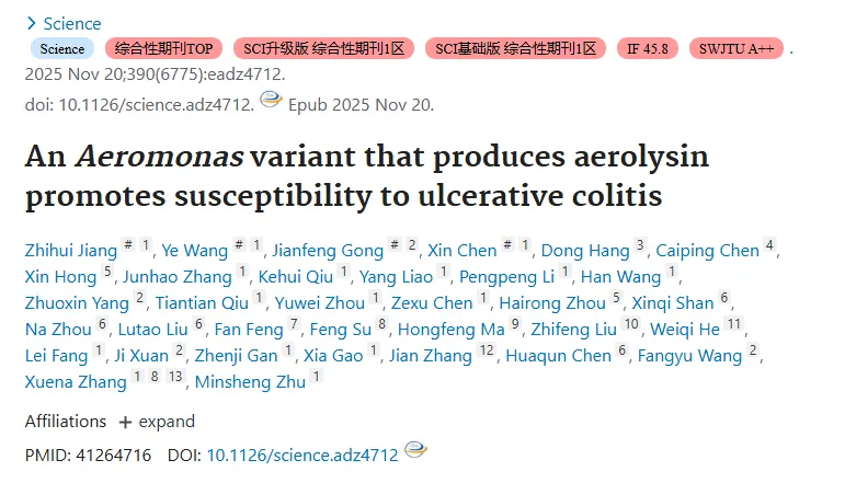 图5检测显示,UC患者粪便中 Aeromonas 的检出率与相对丰度均显著高于健康对照和克罗恩病患者;在UC患者结肠组织中也可检测到 aerolysin 蛋白。