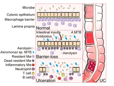 图2表明,从UC患者粪便中分离的细菌培养上清对巨噬细胞具有毒性,经纯化与质谱鉴定该毒素为 aerolysin;巨噬细胞对 aerolysin 的敏感性远高于上皮细胞;并鉴定出产生该毒素的 Aeromonas 变体 MTB。