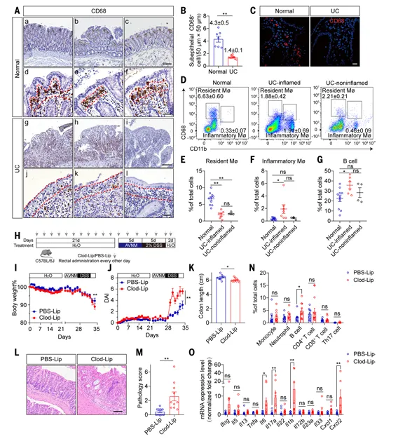 图1显示,在UC患者的结肠组织中,上皮下巨噬细胞在形态完好的区域已显著减少,且巨噬细胞缺失先于明显上皮炎症;动物实验中,巨噬细胞耗损后小鼠对肠道刺激更敏感,易诱发结肠炎。