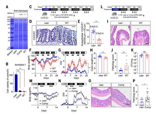图4通过构建 aerolysin 缺陷株及回补实验,证明 aerolysin 是 MTB 引起巨噬细胞破坏和结肠炎所必需的毒素。