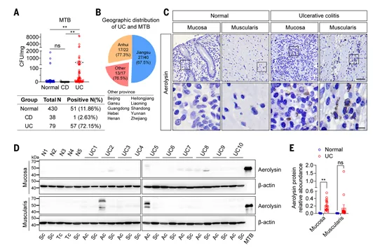 图5.溃疡性结肠炎粪便中分枝杆菌的存在及UC结肠组织中气溶素蛋白的检测