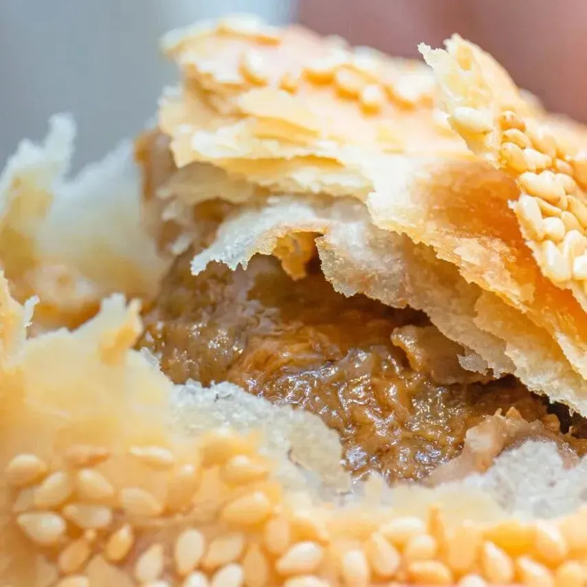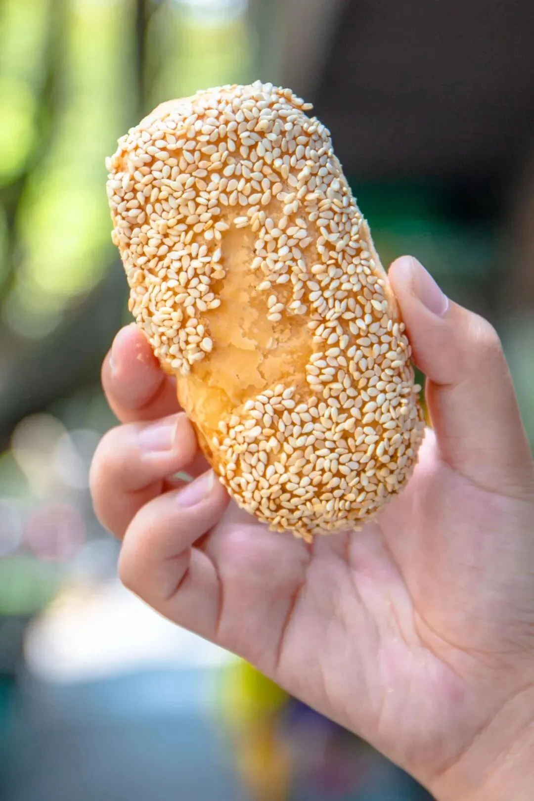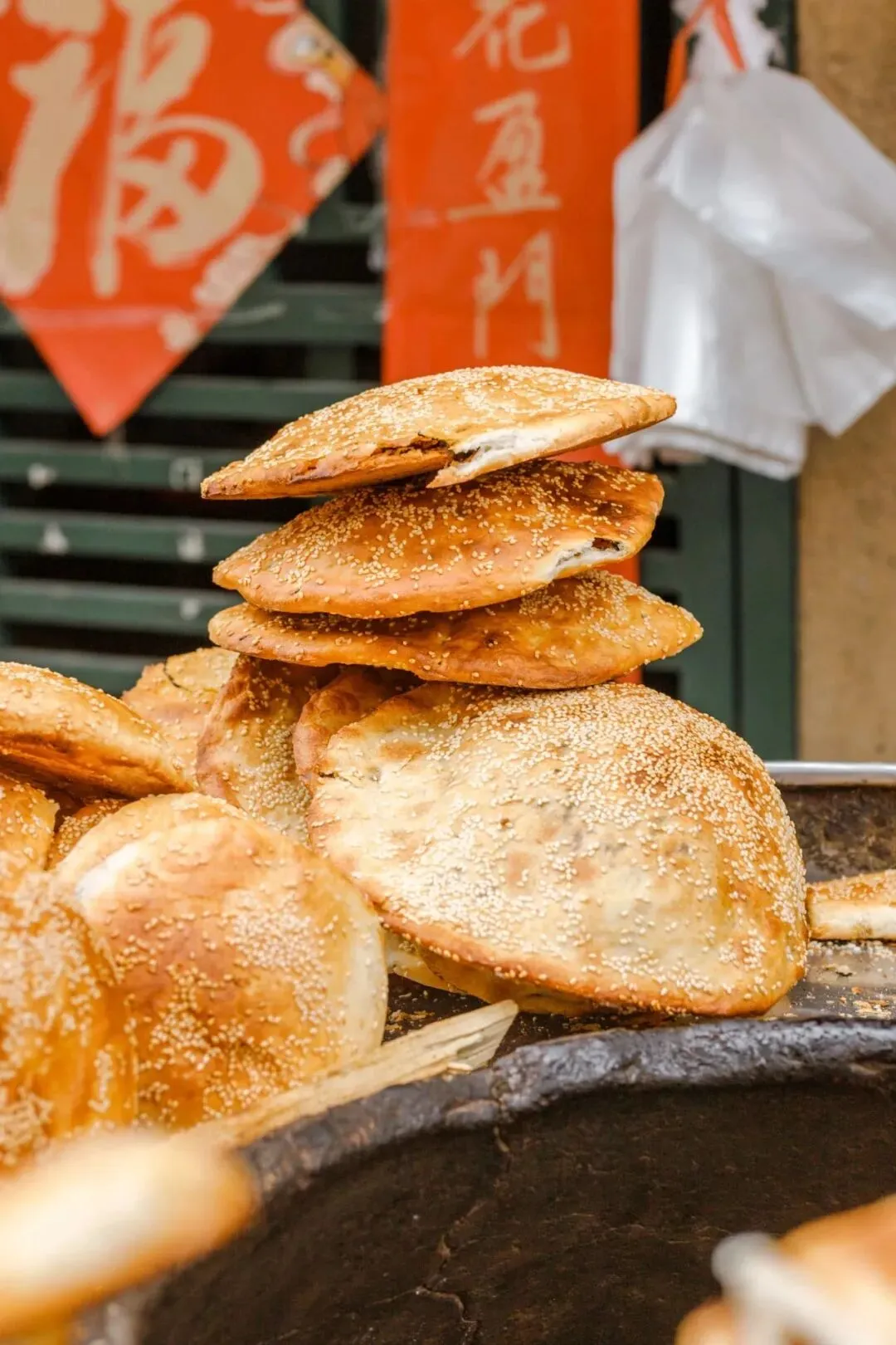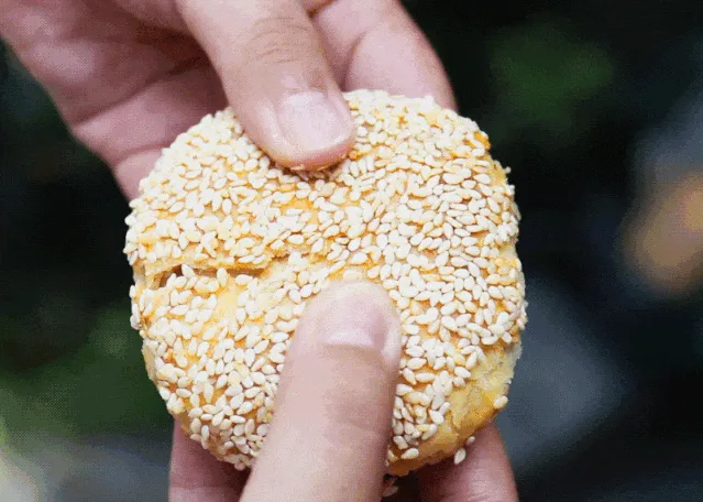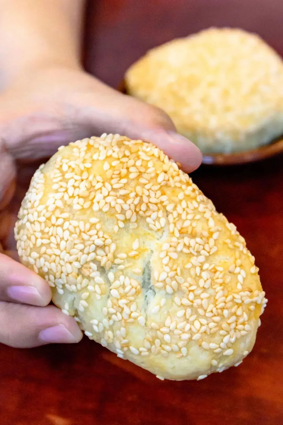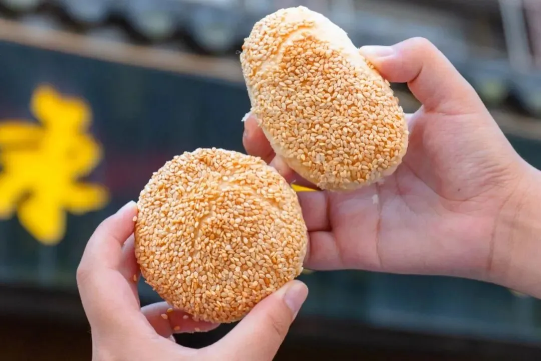 面饼酥脆易碎,芝麻被热气烘出滋味来,混合着甜蜜糖心,回味无穷。