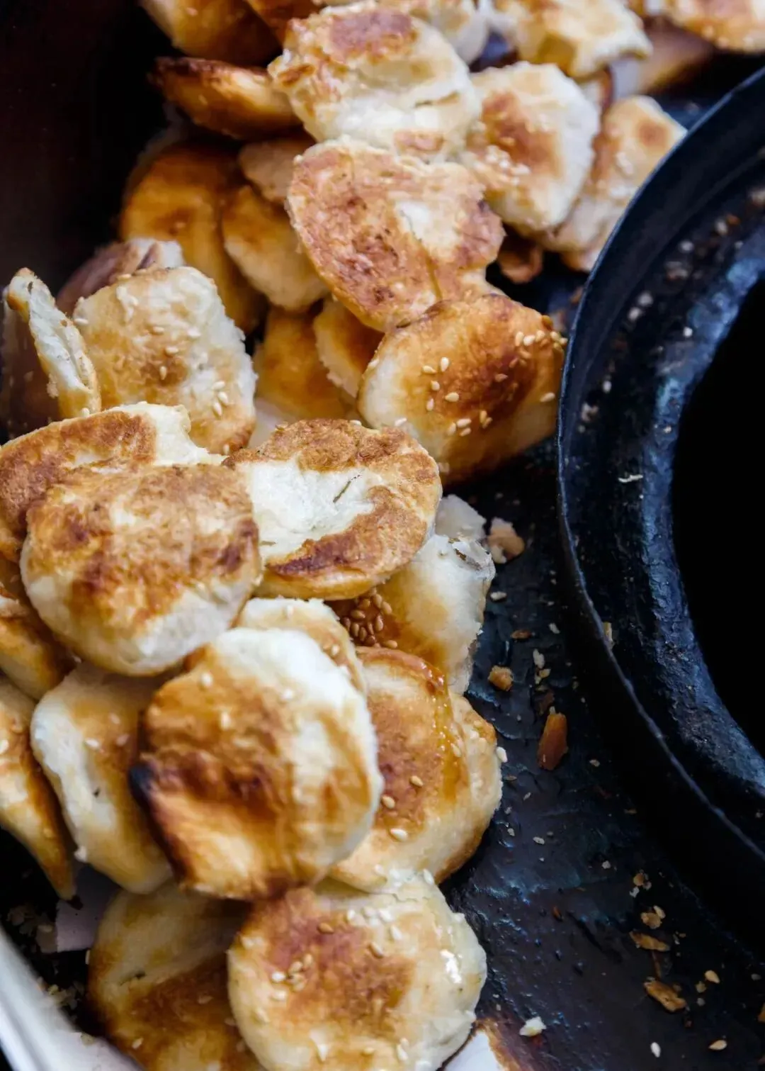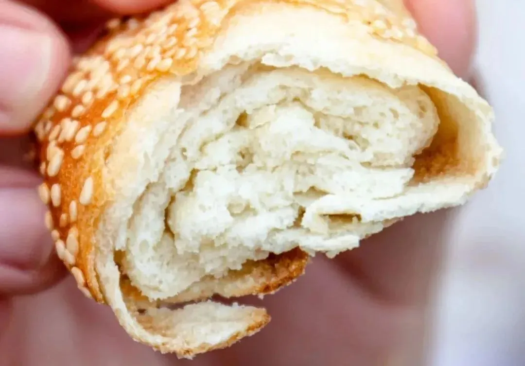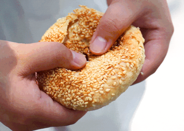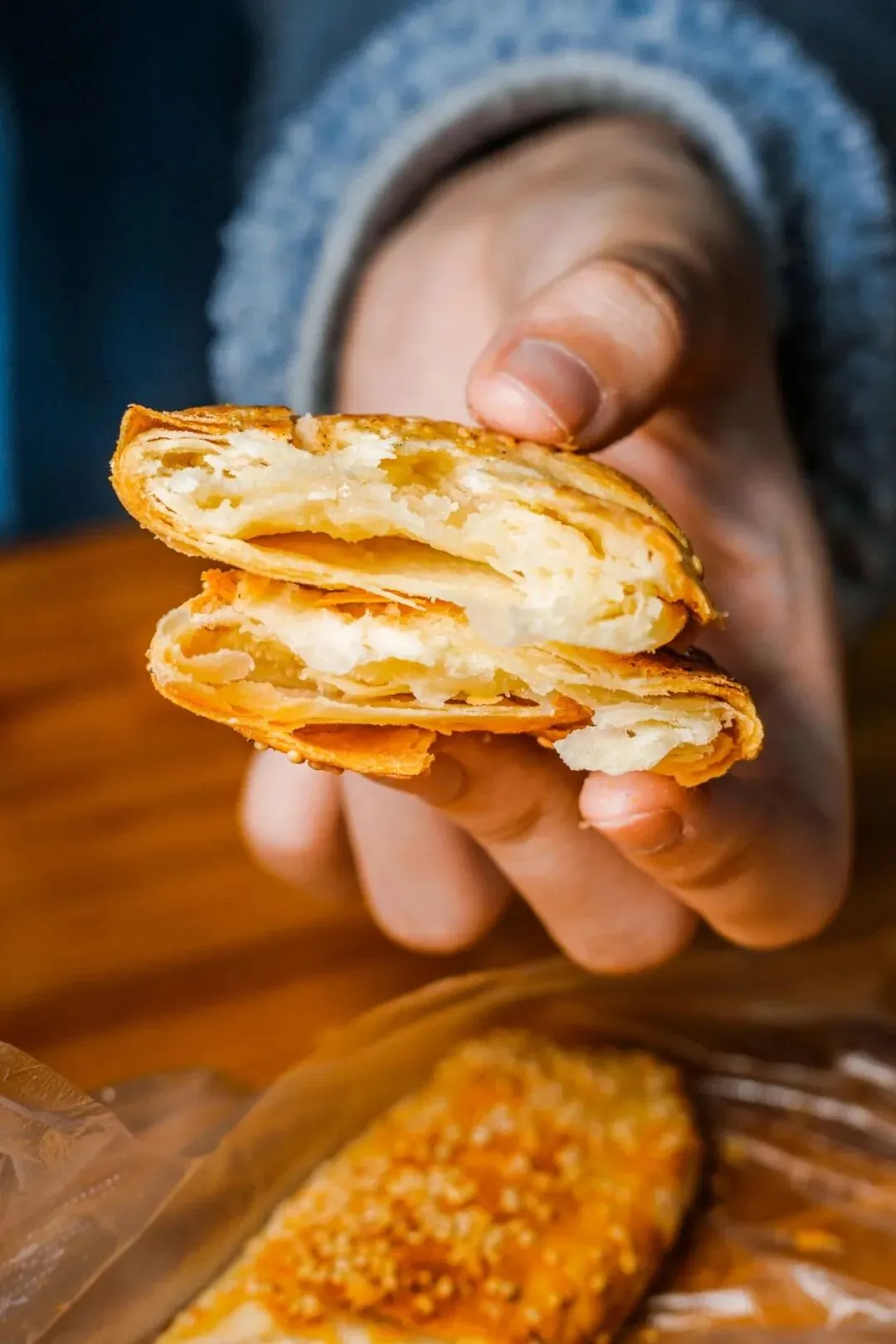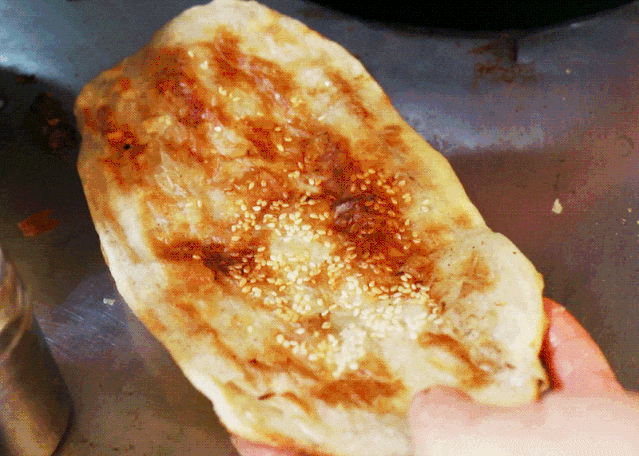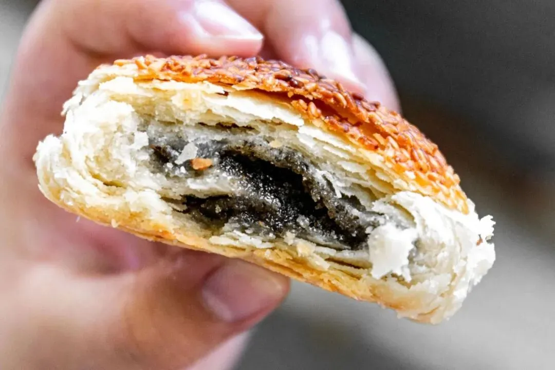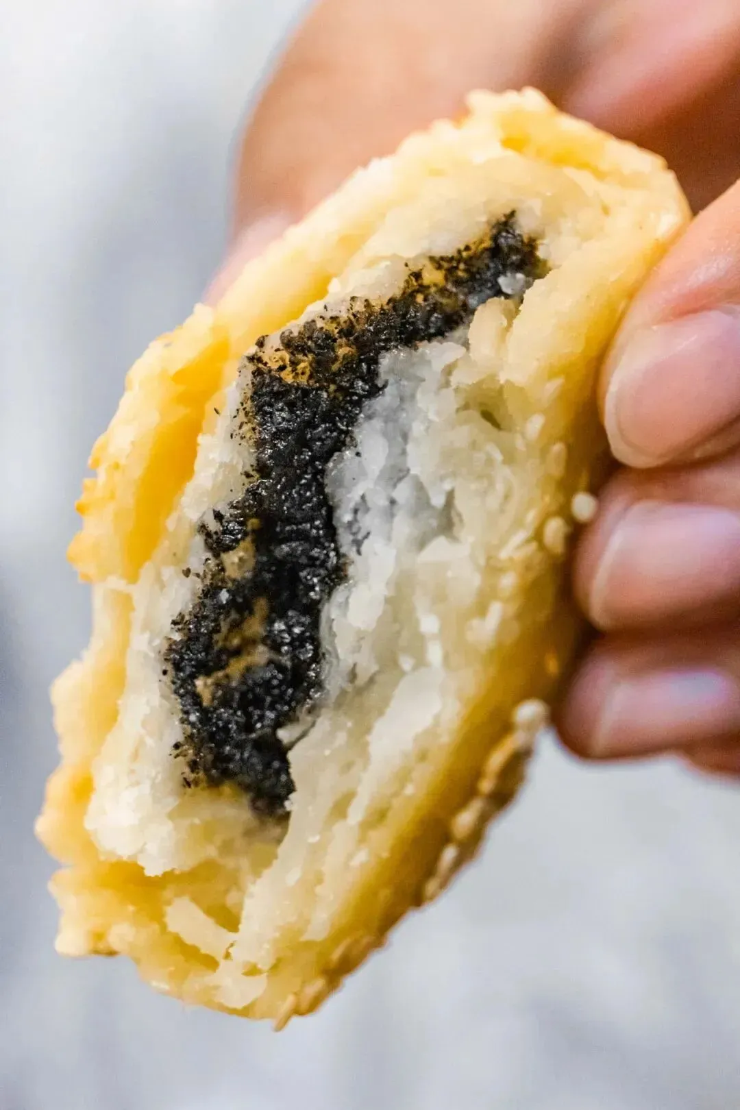 面饼酥脆易碎,芝麻被热气烘出滋味来,混合着甜蜜糖心,回味无穷。