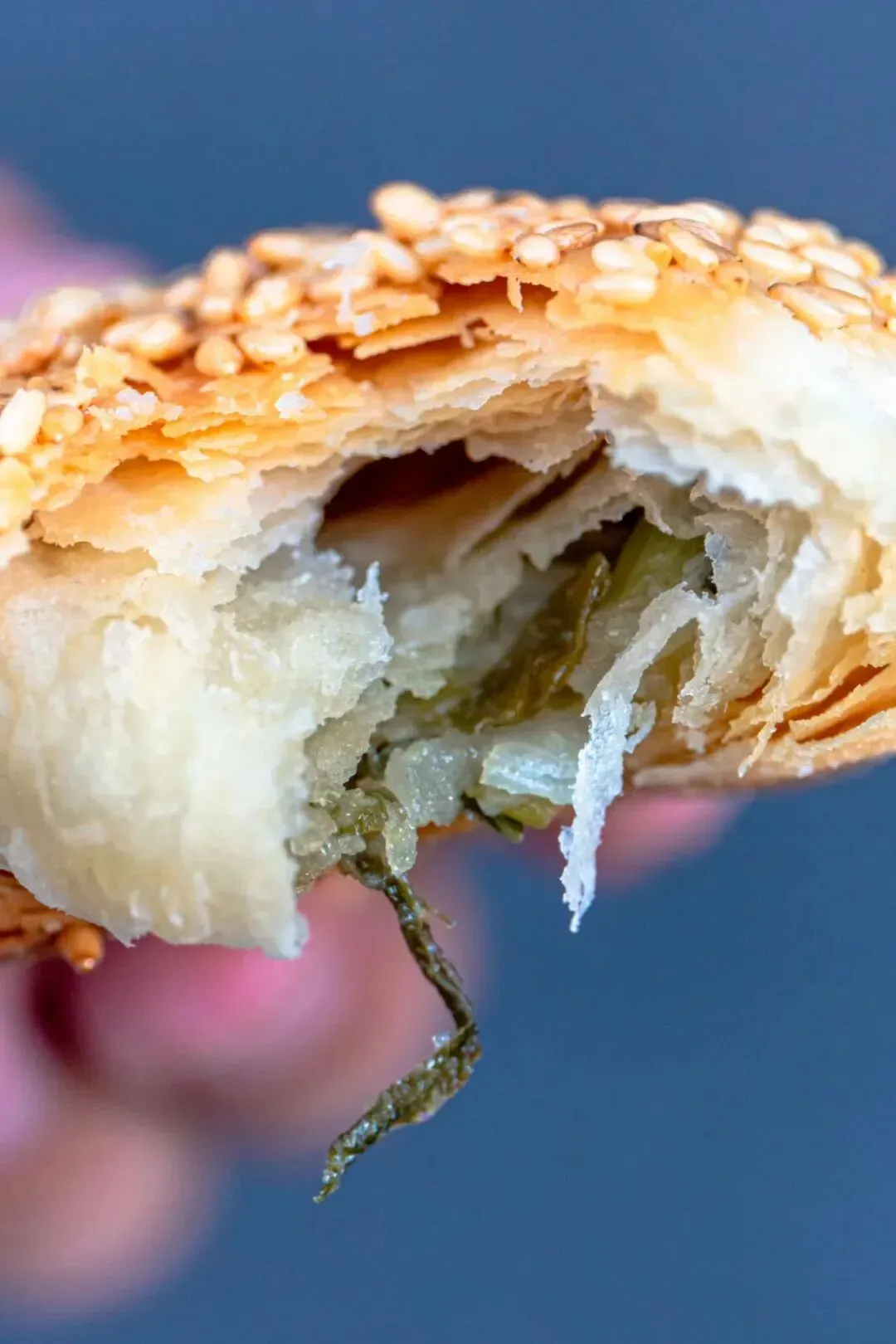 不规则的褶皱覆盖表面,从薄脆处,还透出点梅干菜的诱人色泽来;咬一口,麦子香气率先占领鼻腔,而后才是馅料的咸香回甘。