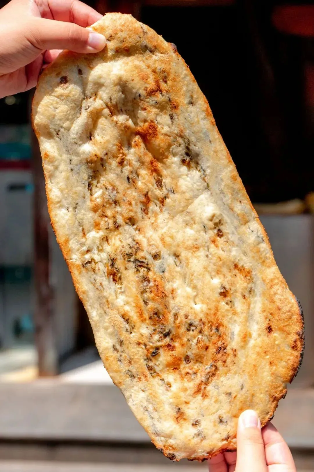 外皮酥脆到掉渣,还带着芝麻和葱的香气,绝对是小时候的味道,附近的居民路过都会随手买几块。