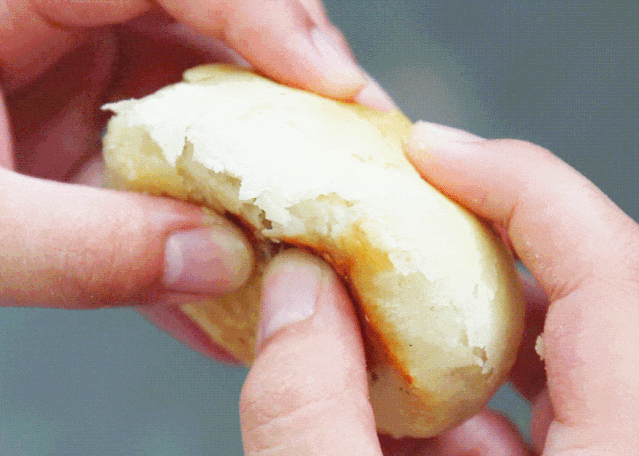 紧而不密的饼身,掰开可见细小的气孔,一口咬下满嘴都是麦香,而外层又因为烘烤保持干爽。