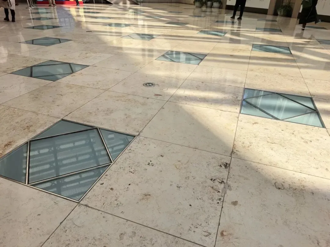 这些带着独一无二天然印记的石材,与七十八块定制玻璃方砖共同铺就了大厅地面。阳光穿透玻璃,在地下一层的六朝遗址上投下点点光斑,被称作“地上的星空”。