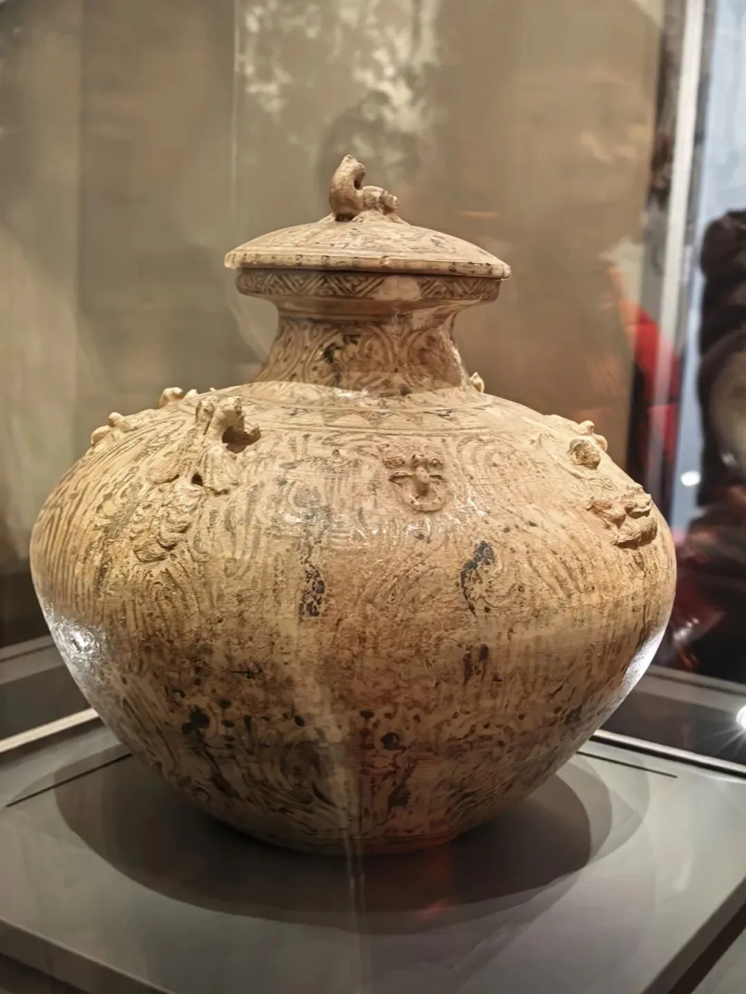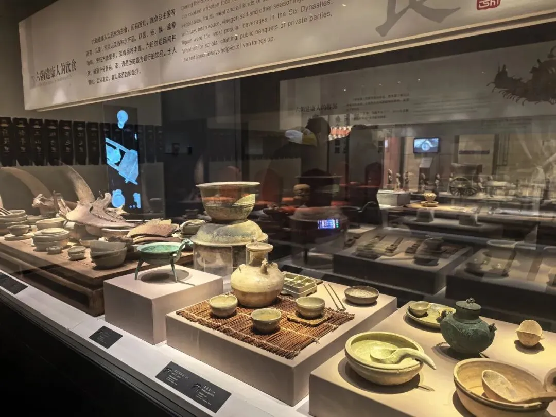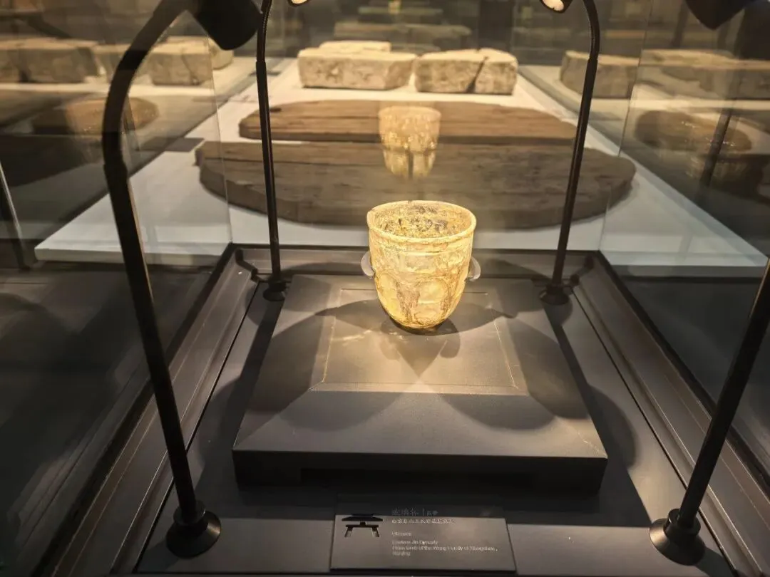 漫步负一层展厅,我终于遇见了传说中“地上的星光”。光影之下,是沉睡千年的六朝宫城夯土城墙;展柜之中,是从罗马帝国经丝绸之路万里而来、最终成为乌衣巷门阀珍玩的玻璃杯;身边是复原的六朝烟火,衣食住行,历历在目。还有被誉为“六朝第一表情包”的人脸瓦当,它是东吴宫殿的檐角表情,也是六朝博物馆最生动的灵魂符号。