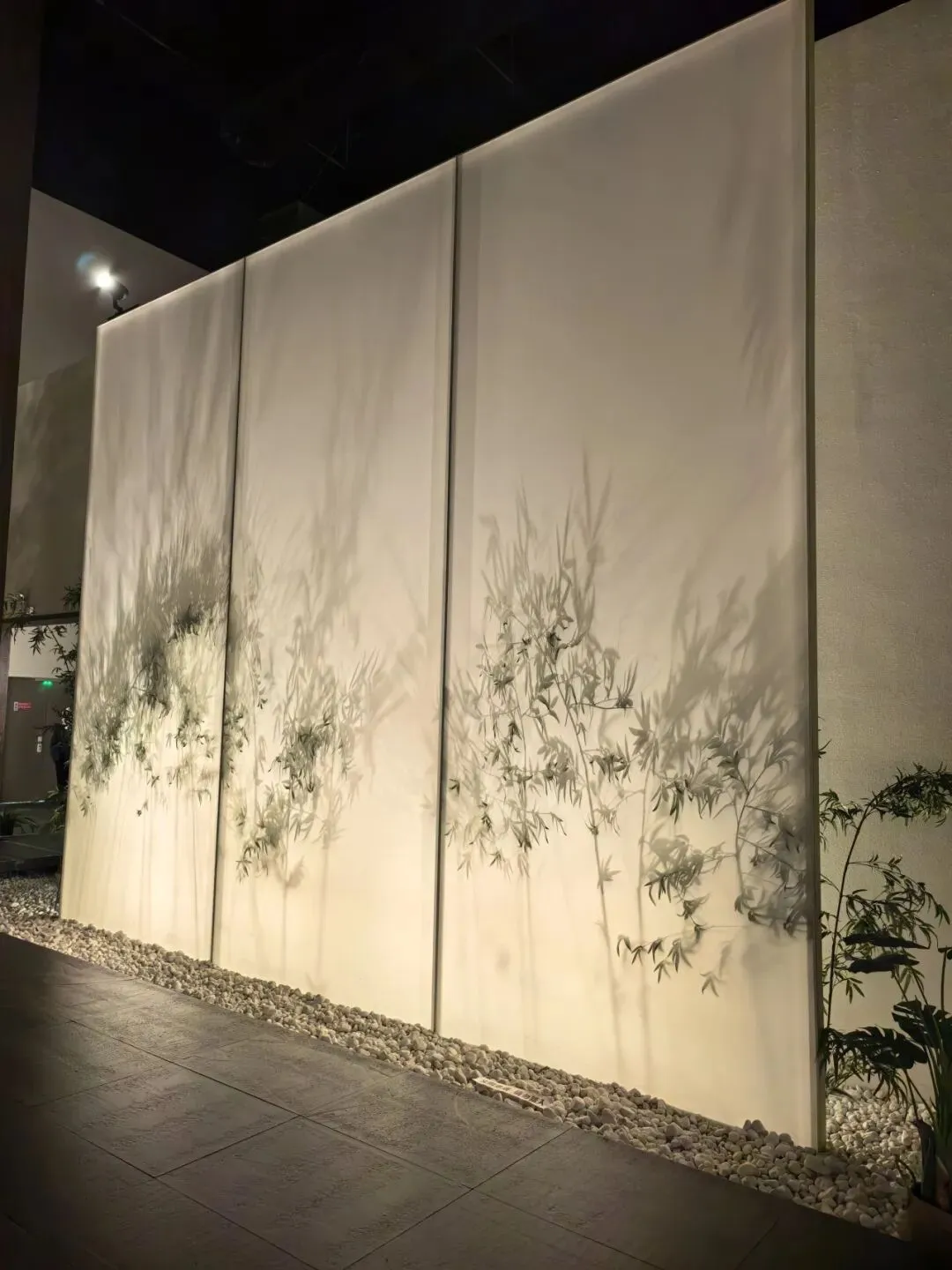 二楼展厅更显雅致,以翠竹、纱幔、屏风、荷叶虚实相隔,通透、静谧、诗意盎然,营造出“一步一景”的江南园林意境,人行走其间,如踏入一幅缓缓展开的六朝画卷。竹影随灯光轻投白幕,将光影之美演绎得淋漓尽致,令人一见倾心。