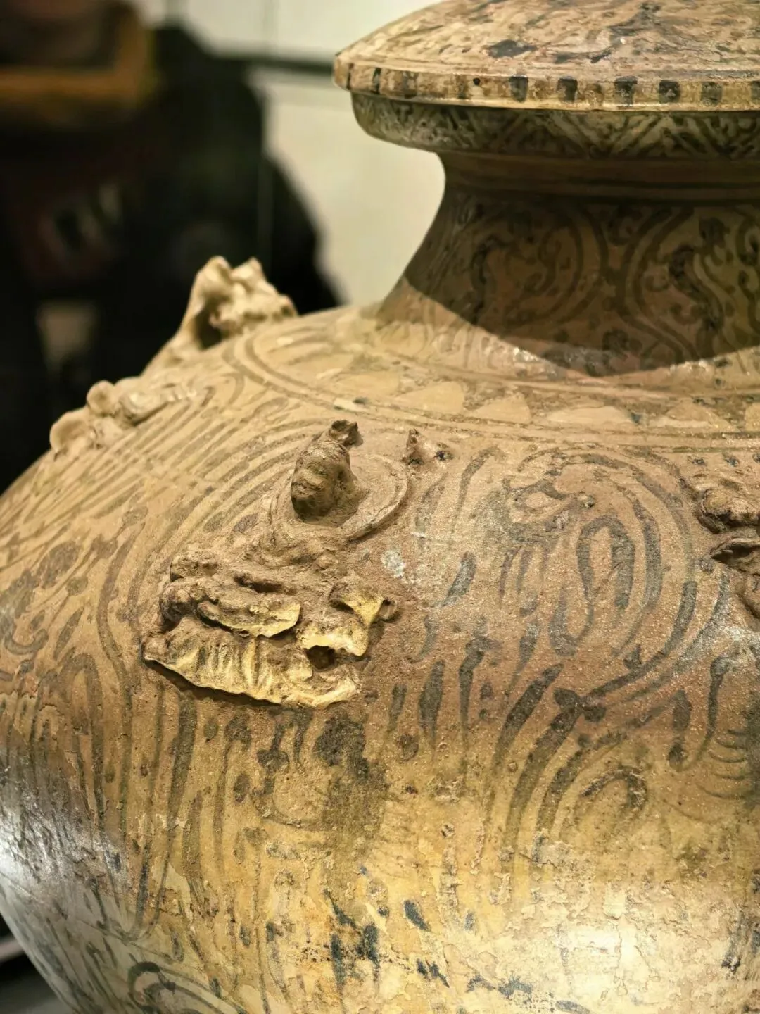 来到六朝博物馆,最不能错过的,便是镇馆之宝——青瓷釉下彩羽人纹盘口壶。它的出土,将中国釉下彩工艺史提前近五百年。壶身之上,羽人飘逸、云气缭绕,佛像庄严、莲瓣清雅,道教升仙意境与早期佛教文化完美相融,生动映照着六朝初年儒释道交汇共生、开放包容的社会气象。
