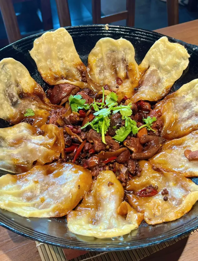 铁锅架在柴火上,咕嘟咕嘟冒着泡。鸡肉得是跑山的,紧实不柴。最绝的是锅边贴的那圈面饼(喝饼),一半浸在汤里吸满了肉汁,软糯咸香;一半露在外面被烘得焦脆。吃的时候,别矜持,直接上手掰饼蘸汤,那滋味,给个神仙都不换。