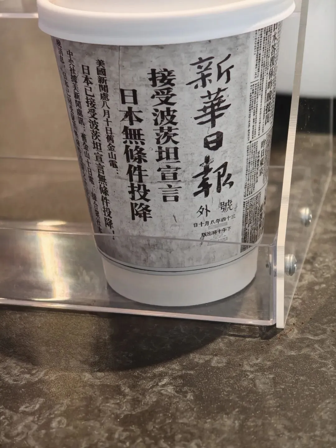 一排排立着的以为是书卷,近看原来都是人名,除了有名有姓的,还有多少无名氏掩埋在历史尘埃中,带着永远也无法掩饰的伤痛。里面人很多,有点黑,心里有点害怕。那恐怕也是人类历史上最至暗的时刻。除了黑就是白,整个展览并不是想象中的血腥,但让人觉得无比压抑、无比哀痛。“万人坑”并不敢看,用余光扫过一眼也是惊心动魄。令我不解的是,展厅有一部分影视播放的地方,包括出口区的大厅一直在循环播放国际友人在南京沦陷期间做出的贡献。我承认拉贝等人的日记具有重要的证据价值,但在整个展览很少有可以坐下的情况下,坐下来就是宣传国际友人,还是令人惊讶。那么多冤屈的灵魂、抗战的勇士,并没有得到大书特书,为什么要对这些所谓的友人浓墨重彩?是希望得到国际舆论的支持吗,至少我是不能理解的。电影《南京照相馆》之所以感人,还是说好了战争中普通人的善良与不屈。负担了那么伤痛、又站起来的民族已经不需要低眉和美化,我们需要的是理智和觉醒。最后,给出口和平驿站的这个文创杯子留个影,挺有特色的。