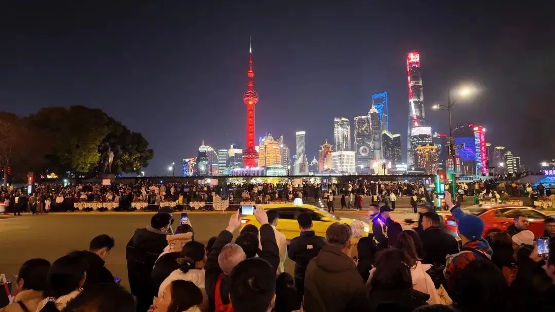 2月17日晚上7点,外滩观光平台上早已是人头攒动,热闹非凡。市民游客们聚集在江堤边,目光紧盯着对岸那流光溢彩的灯光秀,欢声笑语交织在一起,共同营造出新年的喜庆氛围。