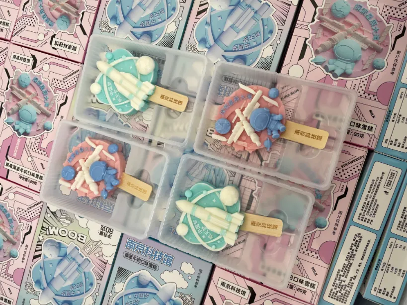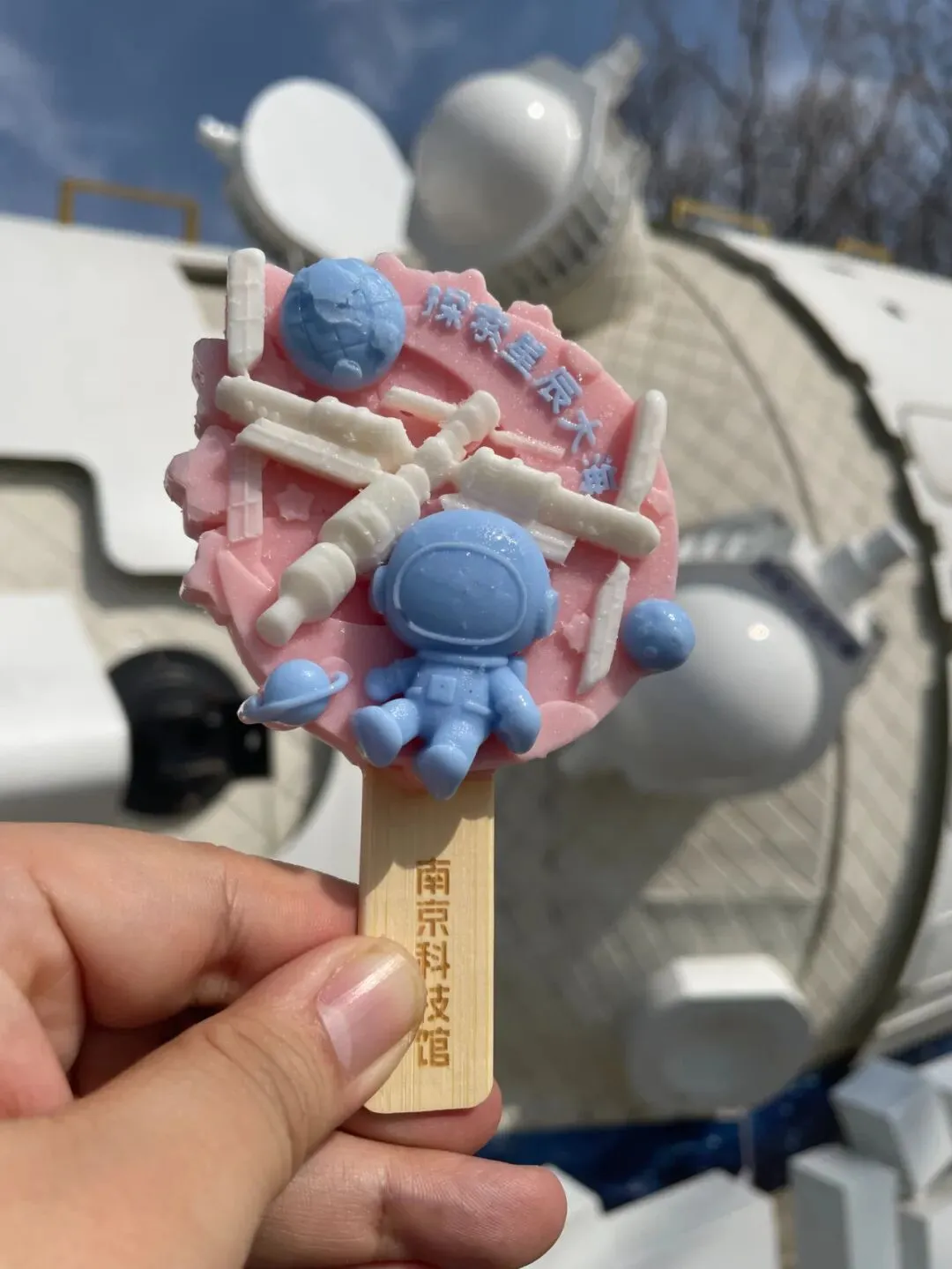 在南京科技馆的穹顶之下,科学与浪漫正悄然交融——航空航天主题文创冰淇淋如一抹轻盈的星云,悄然滑入人间。它以我国空间站核心舱与长征五号运载火箭为灵感,将浩瀚苍穹凝成掌心可握的甜蜜造物。