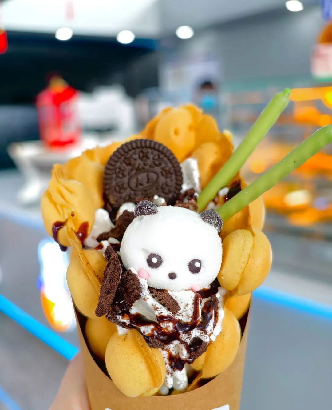 这杯熊猫宝宝奶芙鸡蛋仔,简直是把可爱值拉满了!圆滚滚的熊猫奶芙软fufu的,像刚从竹林里滚出来的小团子,粉扑扑的小脸蛋萌到心化。金黄的鸡蛋仔外脆内软,裹着绵密的奶油和奥利奥碎,巧克力酱像瀑布一样流淌,每一口都是“咔嚓”的脆响和“咻”的丝滑,连快乐都变得有形状了~
